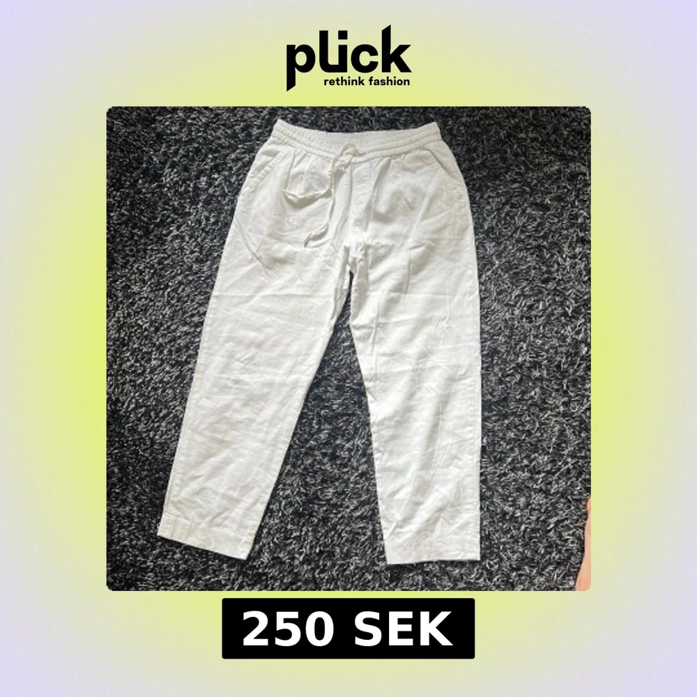 Trött på vita byxor där fickorna syns? Vill du ha världens snyggaste linnebyxor i sommar? Är du runt 170-180 och har lite längre ben. Då är dessa perfekta! Snygga vita linnebyxor med elastisk midja och snörning framtill. Byxorna har raka ben, sidofickor och bakfickor. Perfekta för en chill och avslappnad stil under varmare dagar. Storlek M