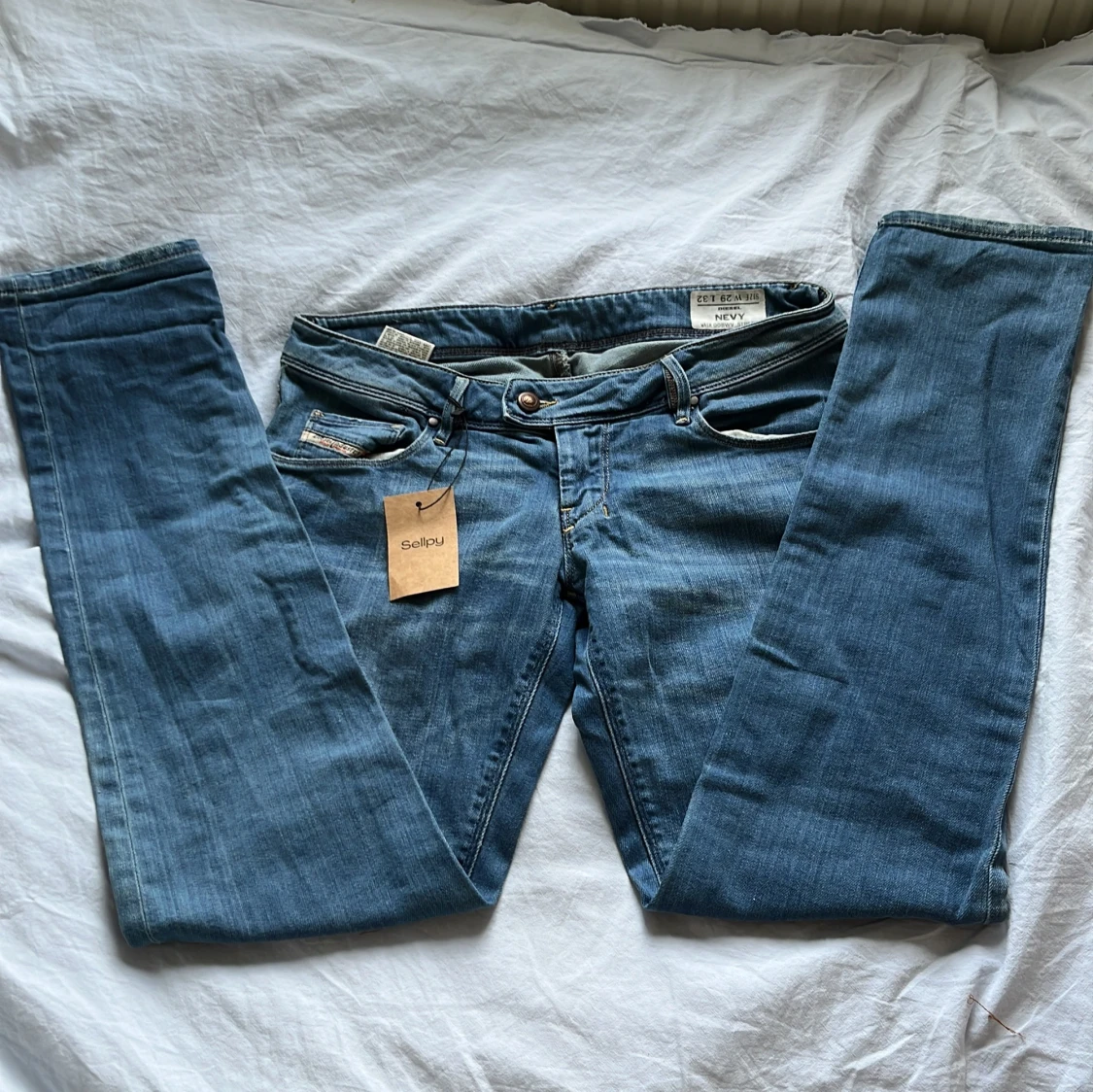 Säljer ett par klassiska blå jeans från diesel med normal passform och raka/skinny ben. Byxorna har fem fickor, knappgylf och en lagad detalj på ena benet. Perfekta till vardags och enkla att matcha med olika stilar. Midjemått rakt över: 41cm. Innerbenslängd: 79cm. Skriv till mig om funderingar, pris kan diskuteras💕