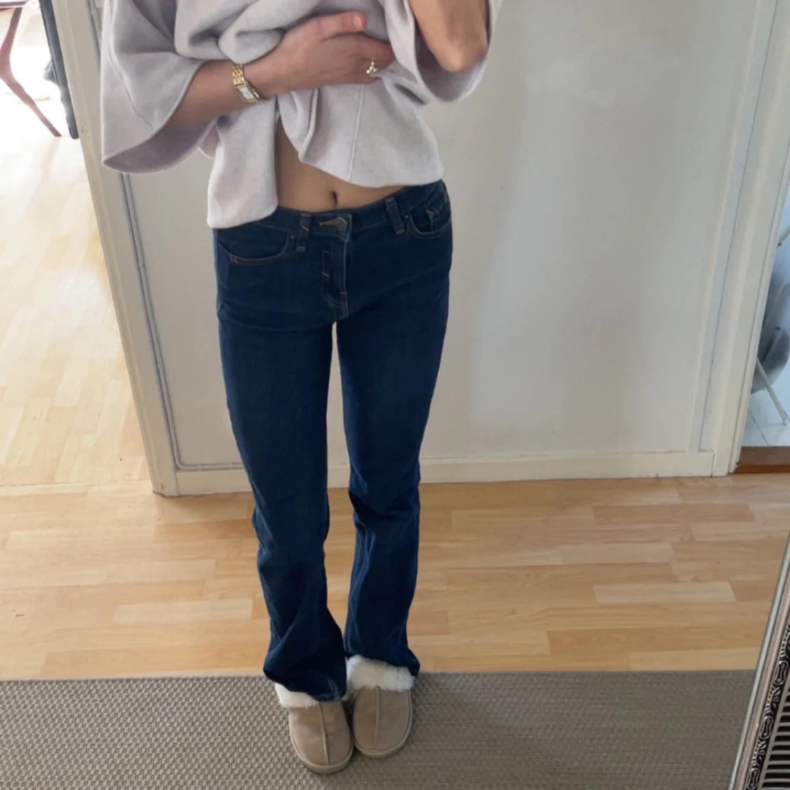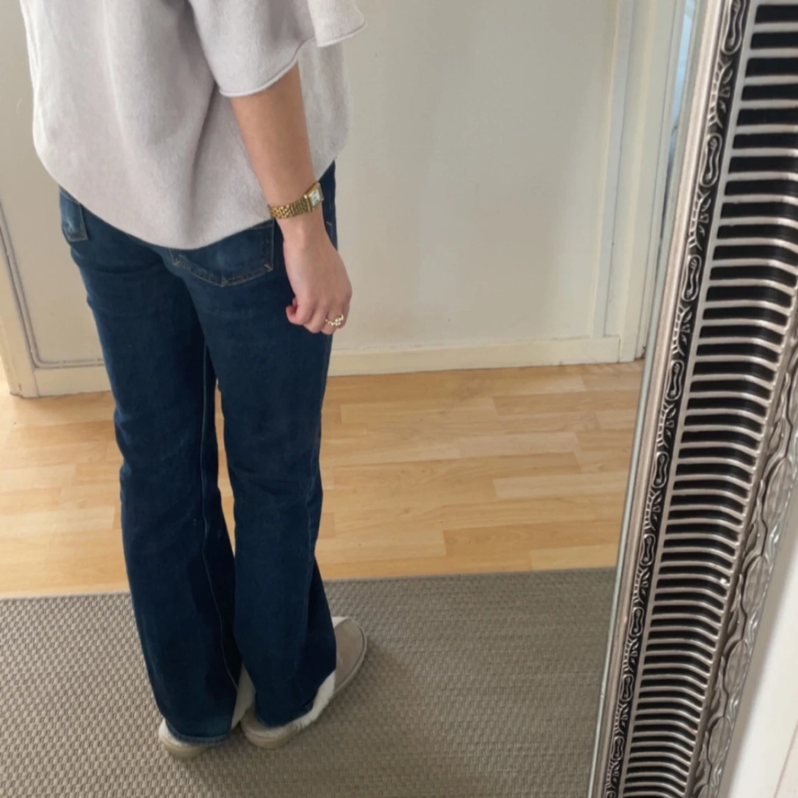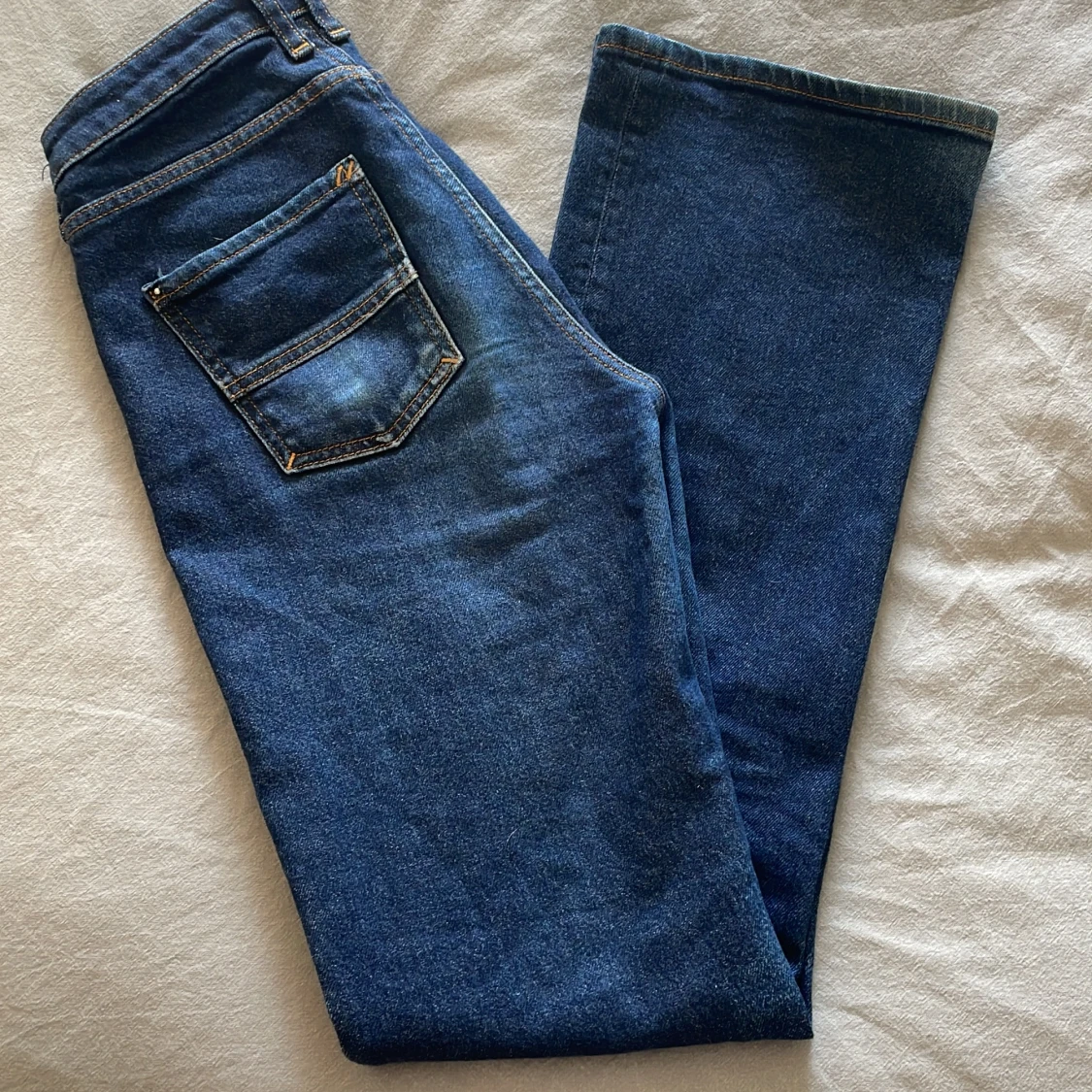 Snygga mörkblå jeans i midrise med bootcut, stål 25/34 (XS). De har en normal passform och sitter som ett smack. Jag är 160 för referens💕 skriv gärna för mer info eller bilder