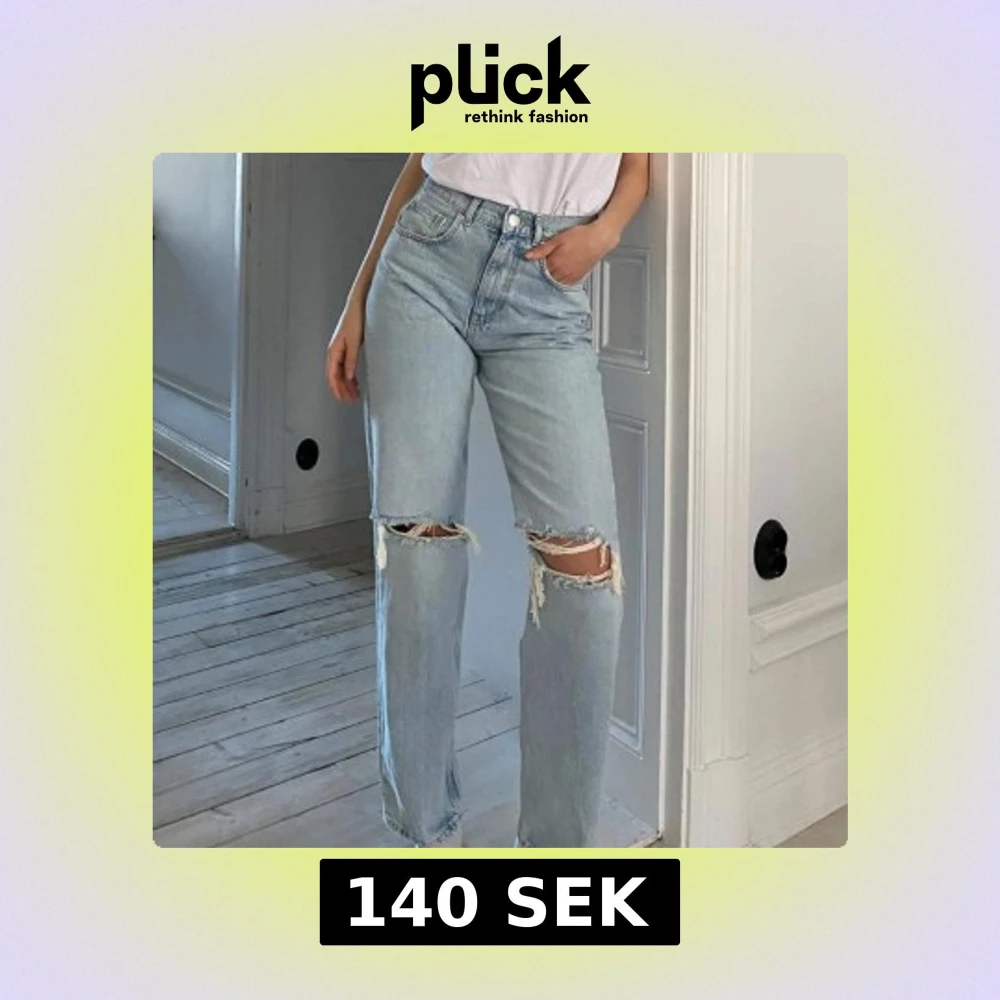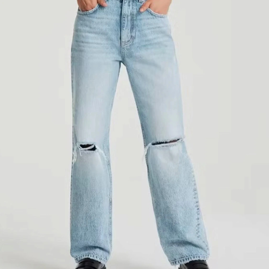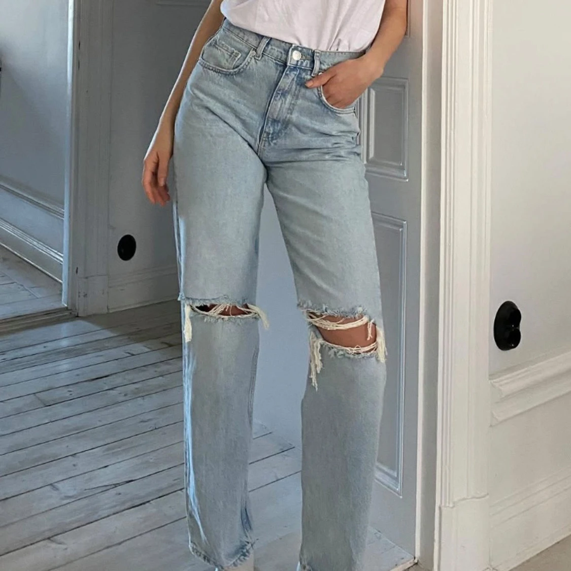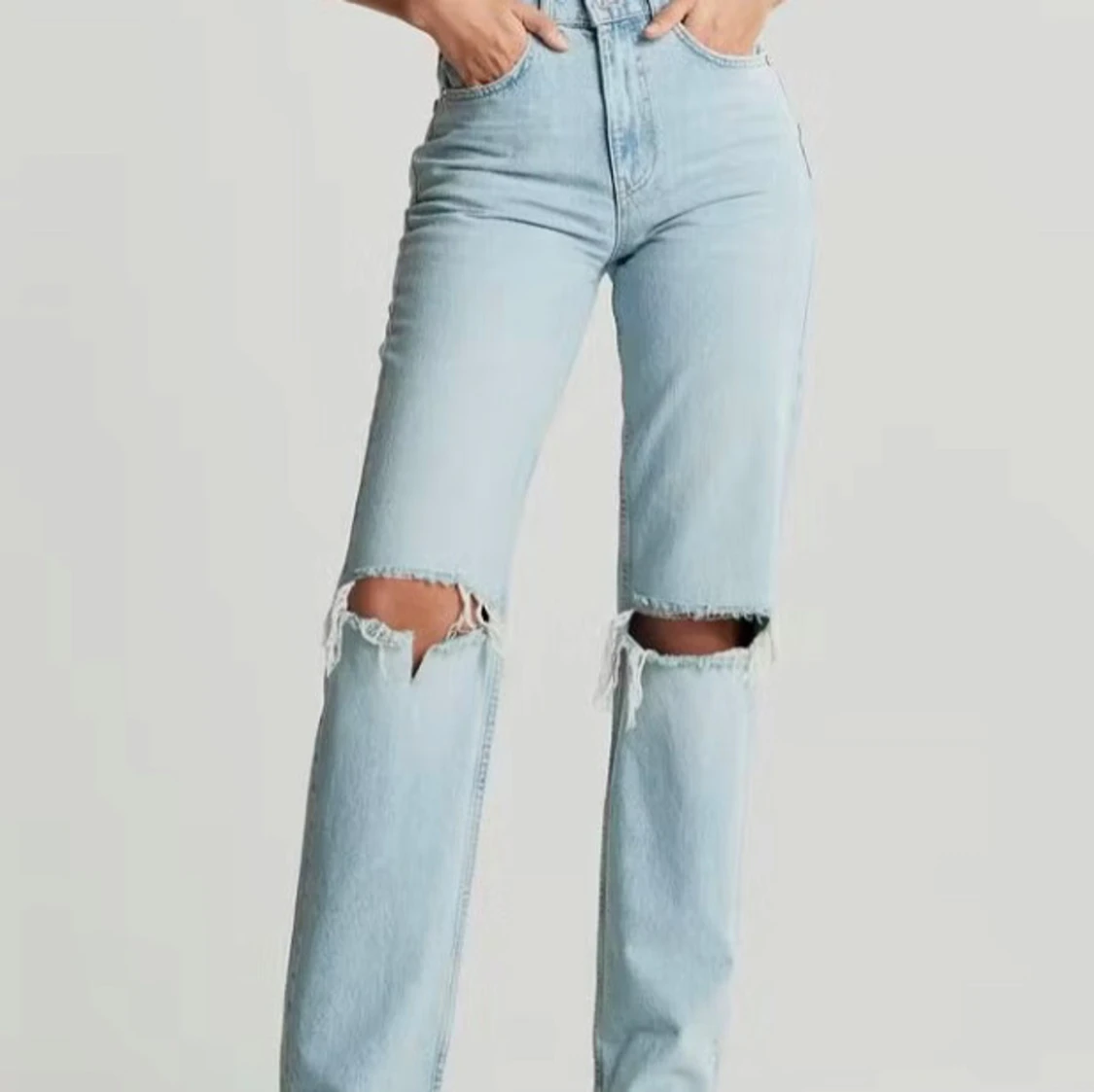 Snygga ljusblå jeans med slitningar vid knäna. De har en hög midja och en rak passform helt ny prislapp på storlek 34 inga defekter