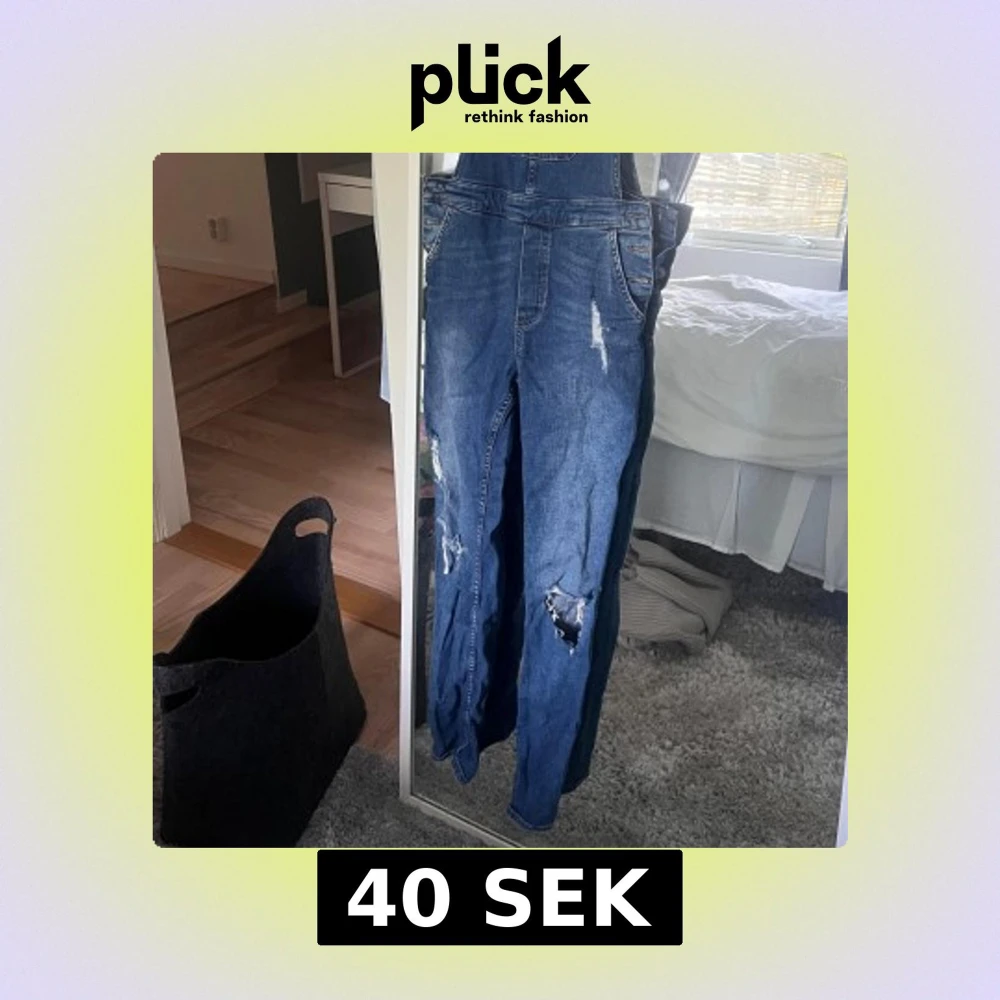Säljer ett par blå denim hängselbyxor från H&M med slitna detaljer på benen och klassiska fickor både fram och bak. Byxorna har raka ben och justerbara hängslen för en bekväm passform. Perfekt för en avslappnad och trendig look.