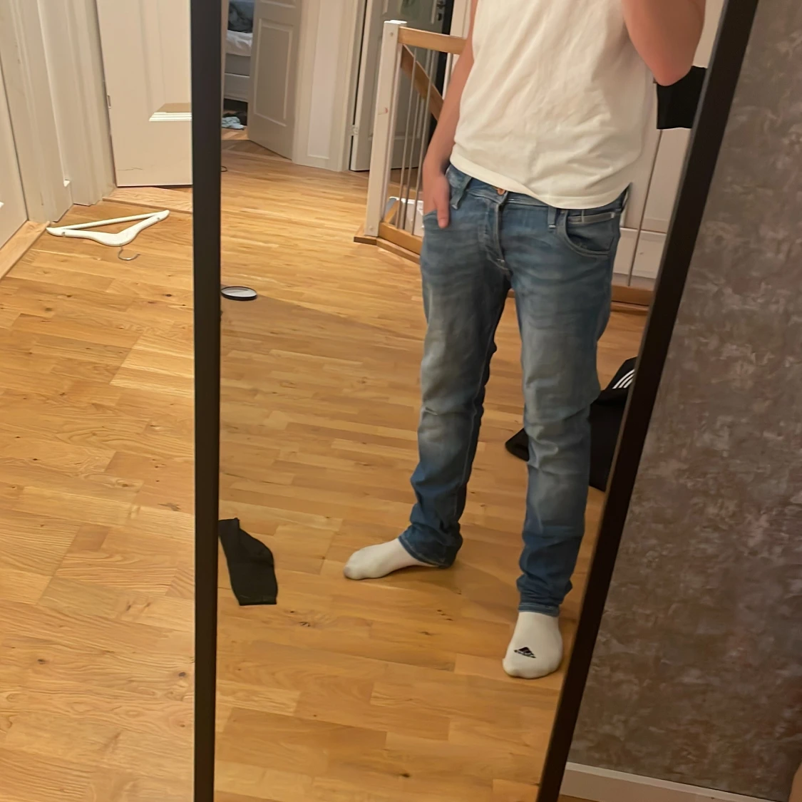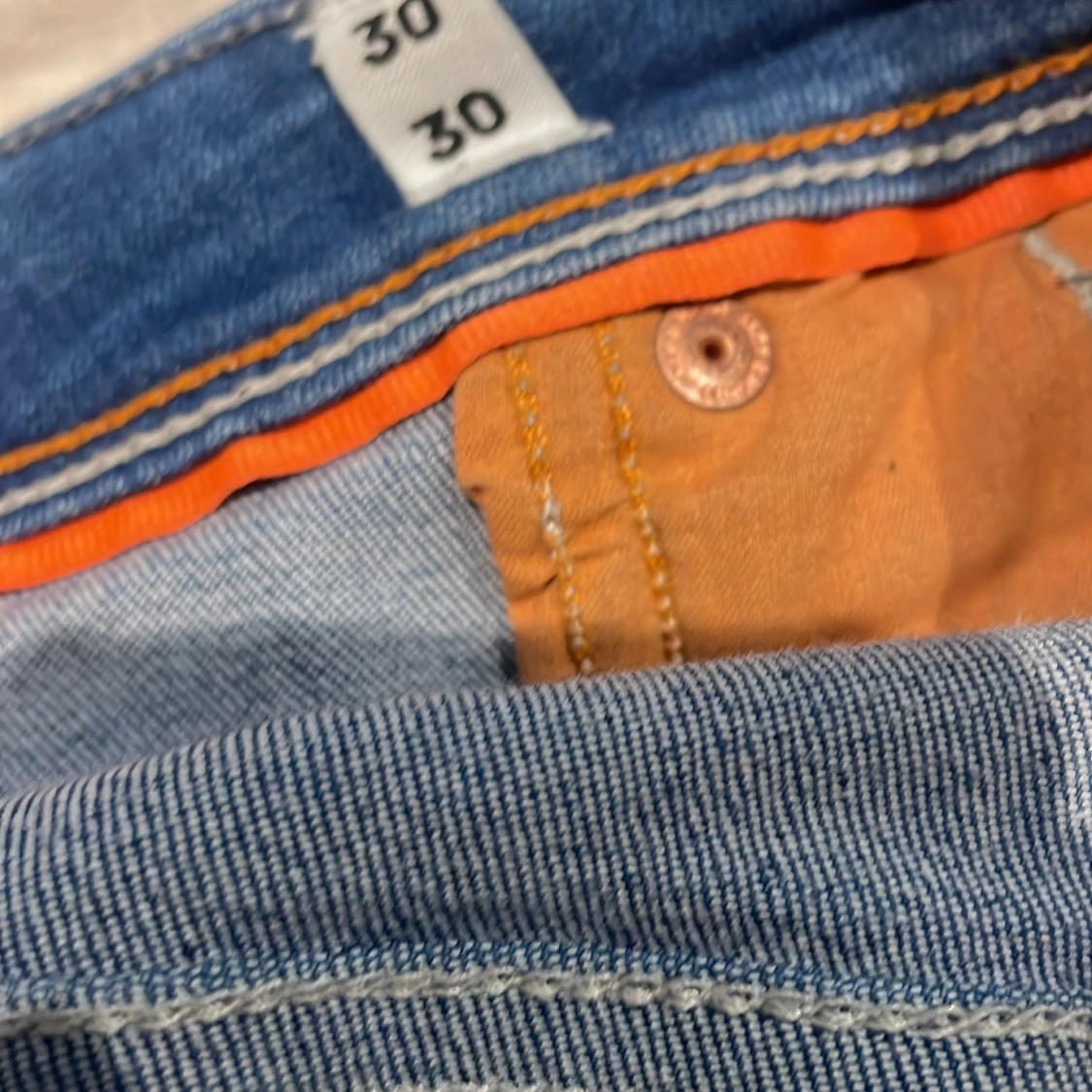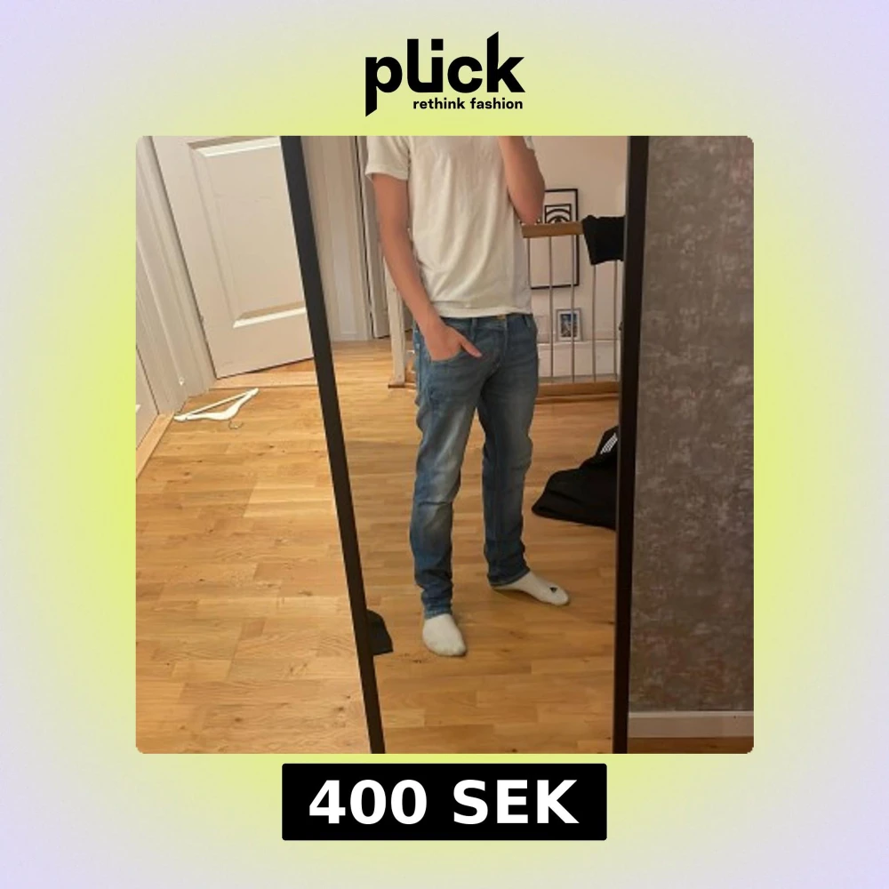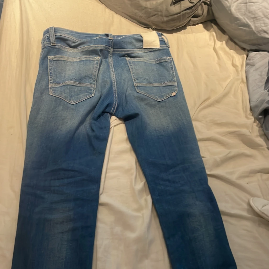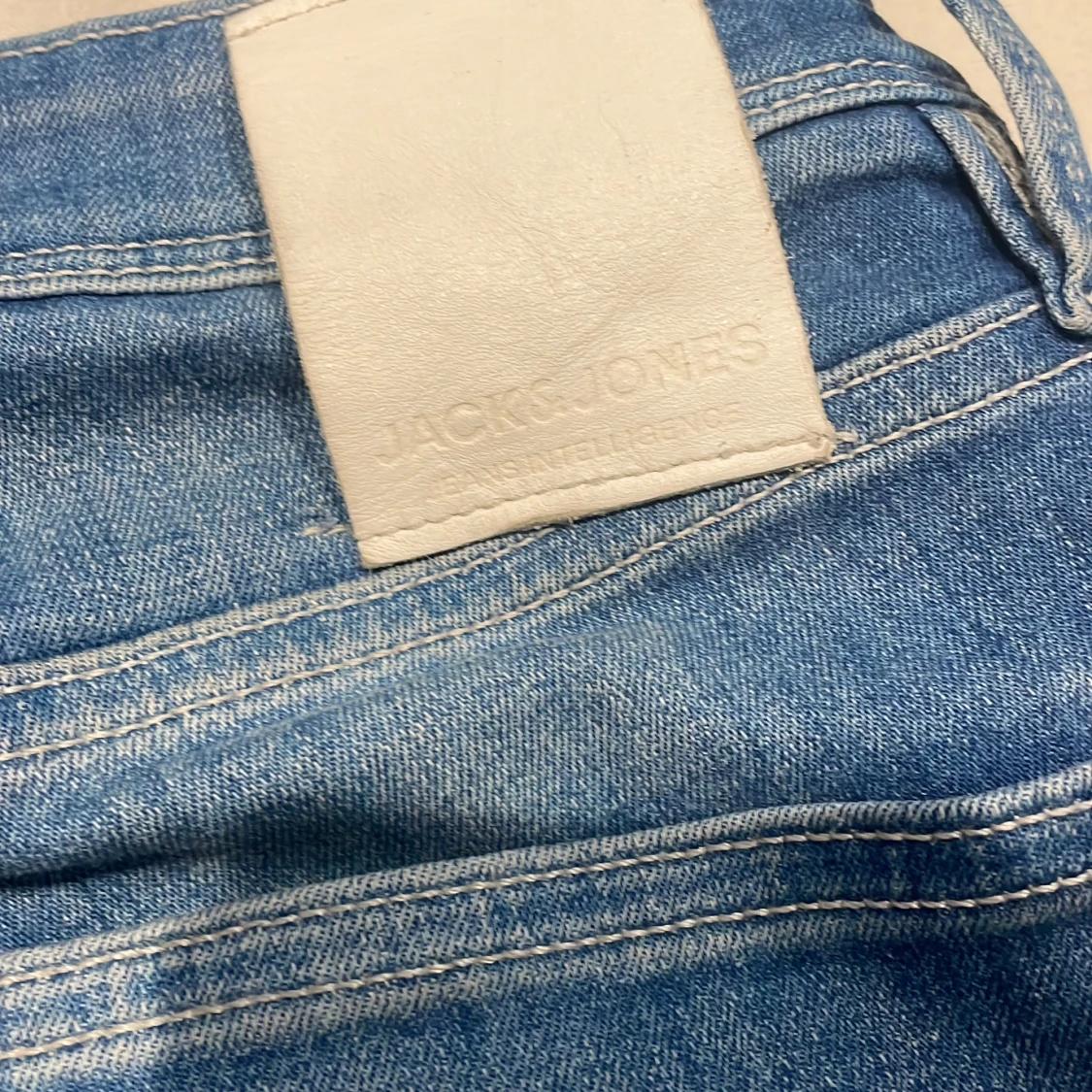 Säljer ett par klassiska blå jeans från Jack & Jones. Jeansen har fem fickor, normal passform och raka ben. De är tillverkade i denim och har en snygg tvättad look med ljusare partier på låren och bak. Perfekta till vardags! Väldigt bra skick.