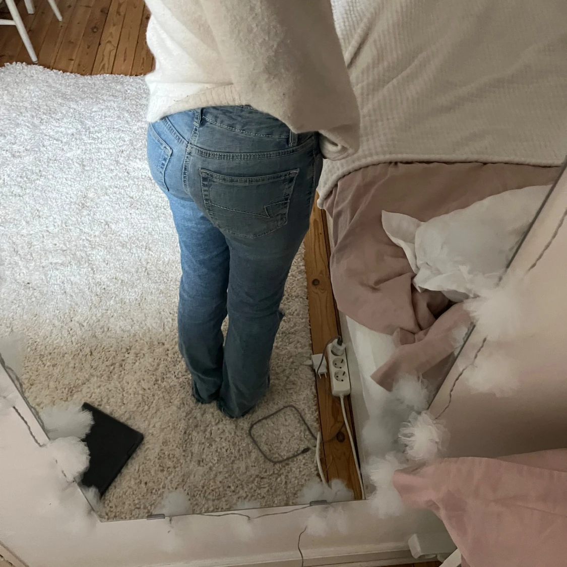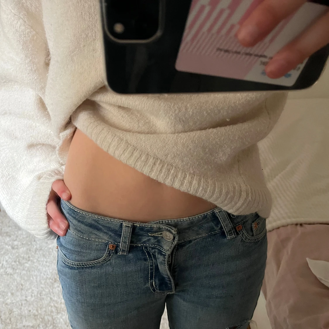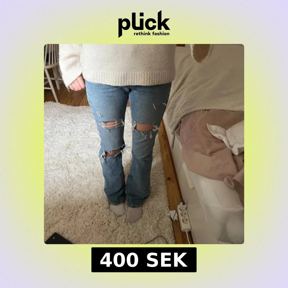 Säljer ett par blå jeans med slitningar på knäna och låren. De har en klassisk femficksdesign och är lågmidjade. Perfekta för en avslappnad stil. Storlek Xs junkyard storlekar 💕💕