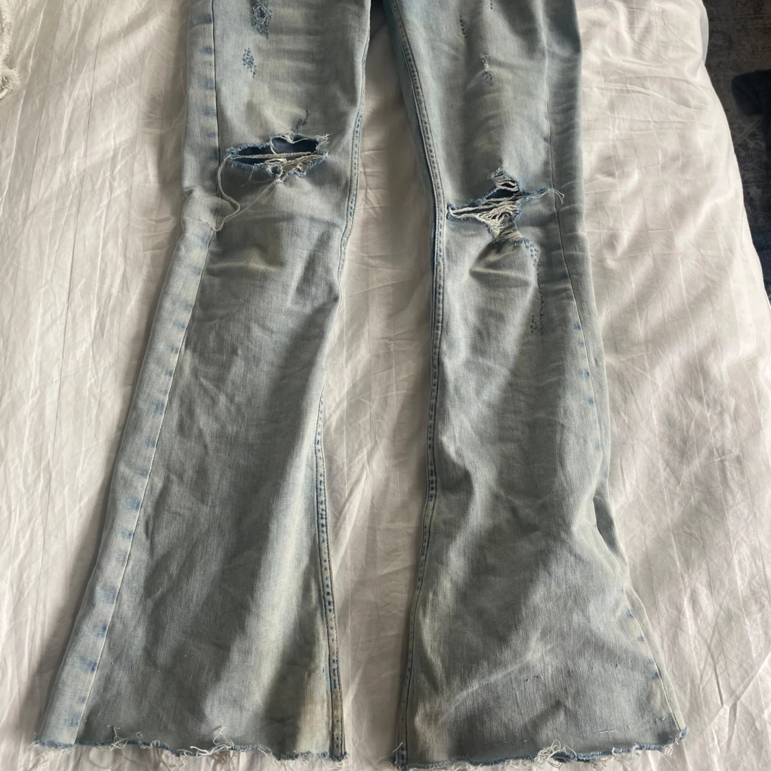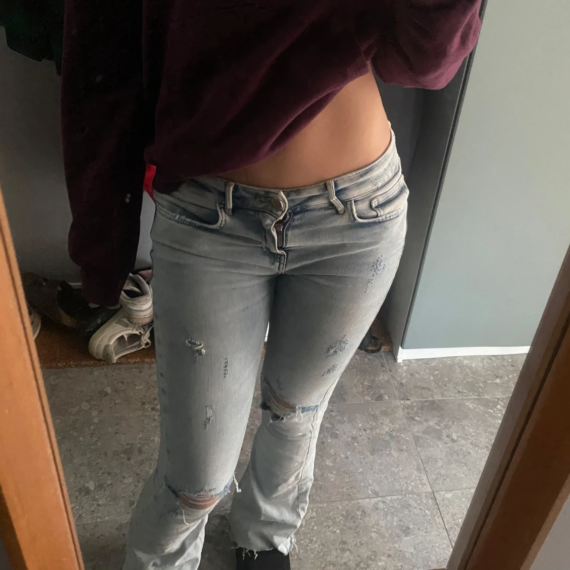 Jätte snygga low jeans med hål på knäna och lite slitningar storlek 34❣️köpta på plick och hon hade klippt av dom så passar 165 och neråt lite små fläckar kom privat