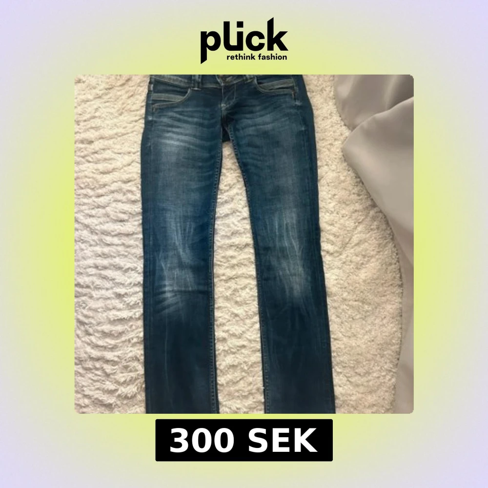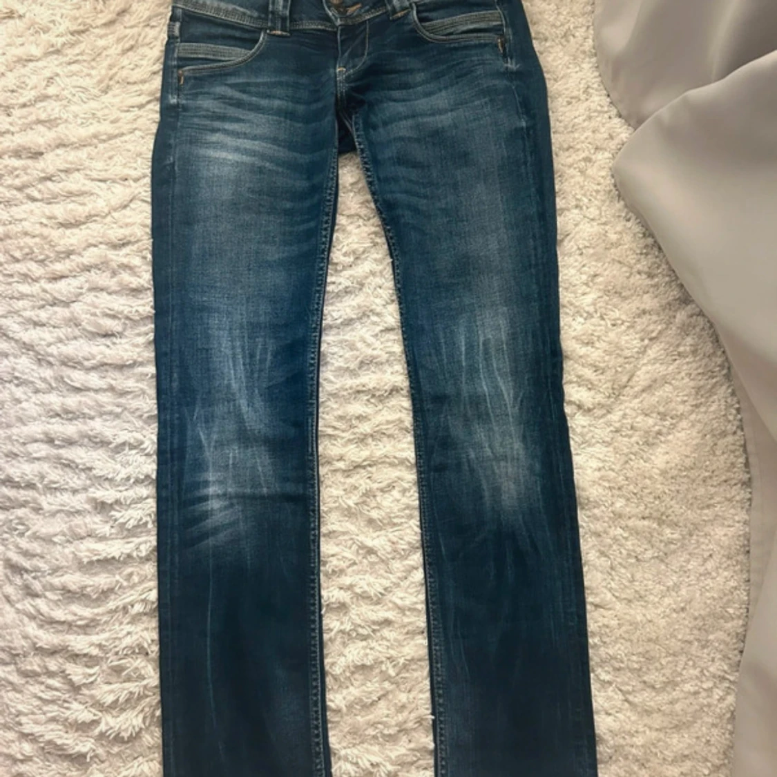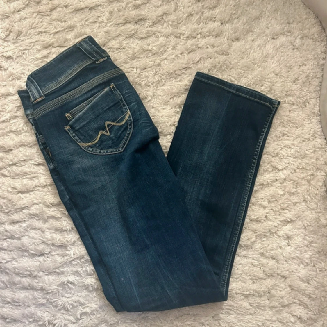 Snygga blå jeans med låg midja och raka ben. Jeansen har klassisk femficksdesign, slitningar framtill och cool broderad bakficka. Säljer för att dom tyvär inte passar mig men dom är i väldigt bra skick