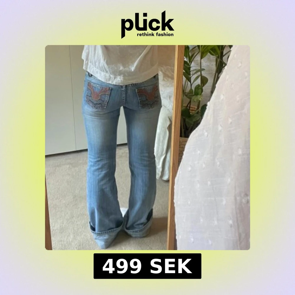 Snygga ljusblå bootcut jeans med unika broderade detaljer på bakfickorna. Jeansen har en låg midja och en klassisk femficksdesign. Jeansen har ingen stretch och är ca 8 dm dör långa på mig som är 160 (dock snyggt att dom är långa). Skriv om du har frågor!💕