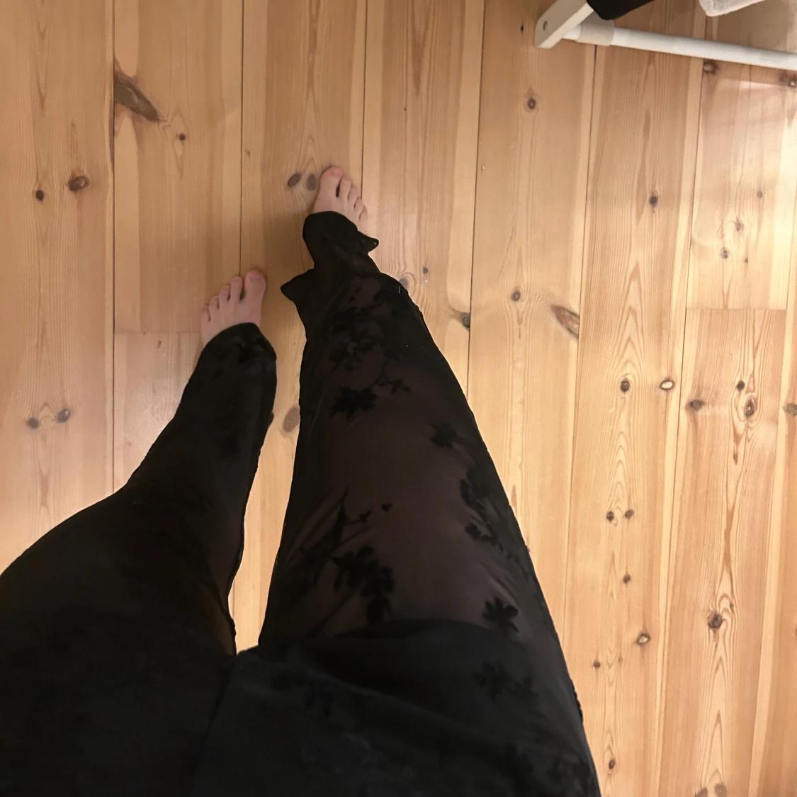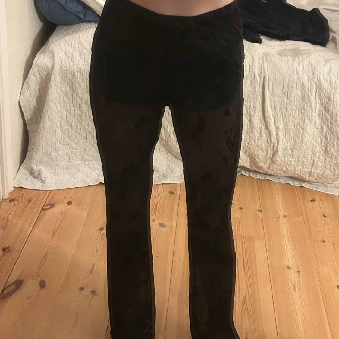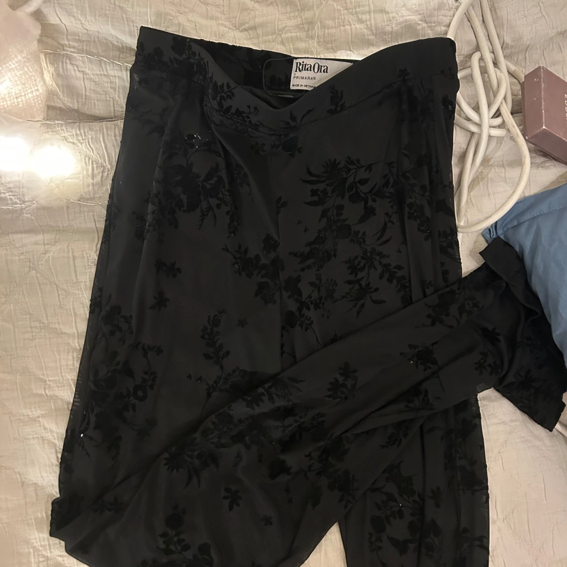 Snygga svarta byxor i sammet från Rita Ora med diskret blommigt mönster. Strl M, oanvända, 90kr