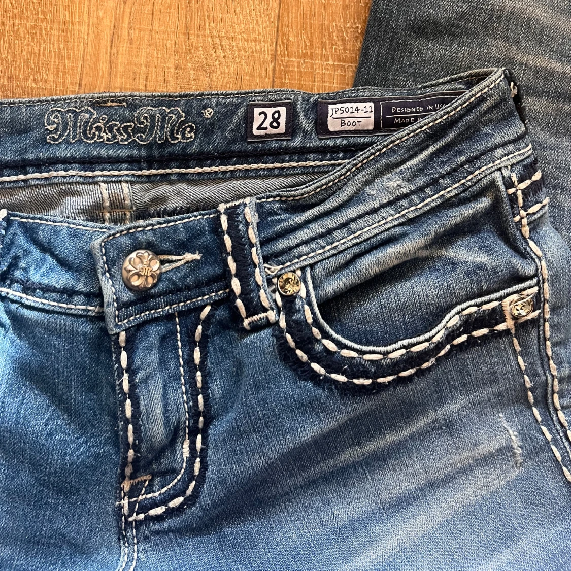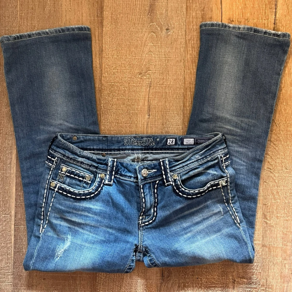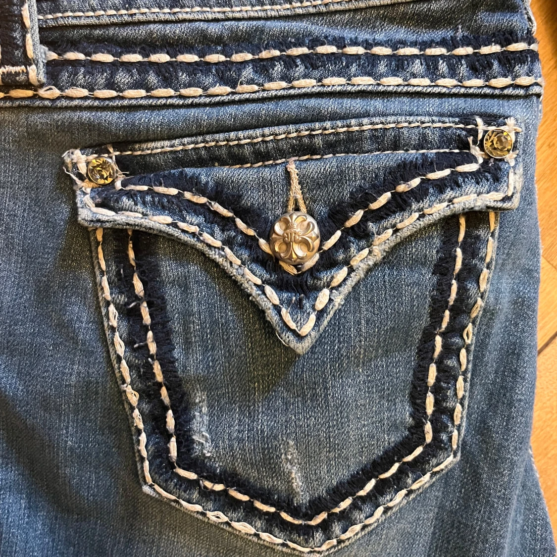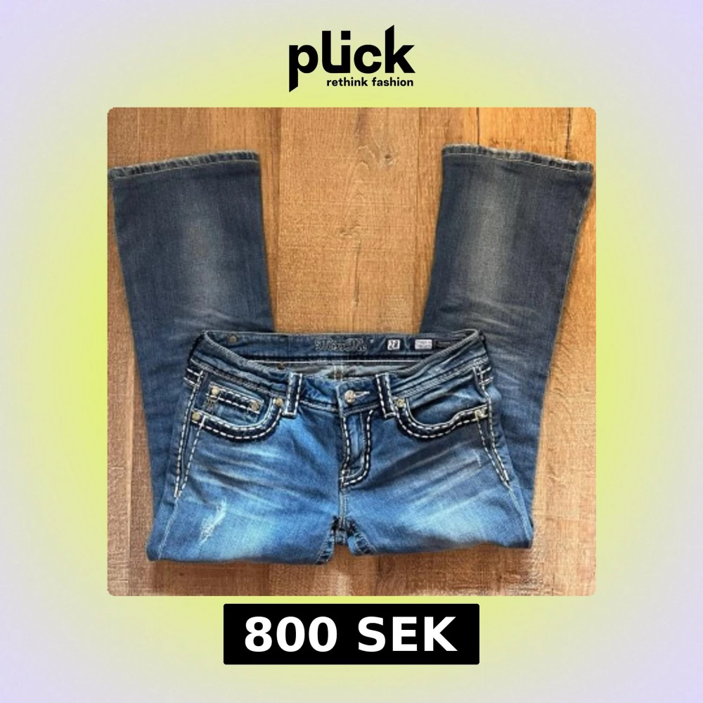 Jättesnygga jeans från Miss Me. Dom är bootcut och lågmidjde. Dom saknar en knapp men inget man tänker på (se på sista bilden)
