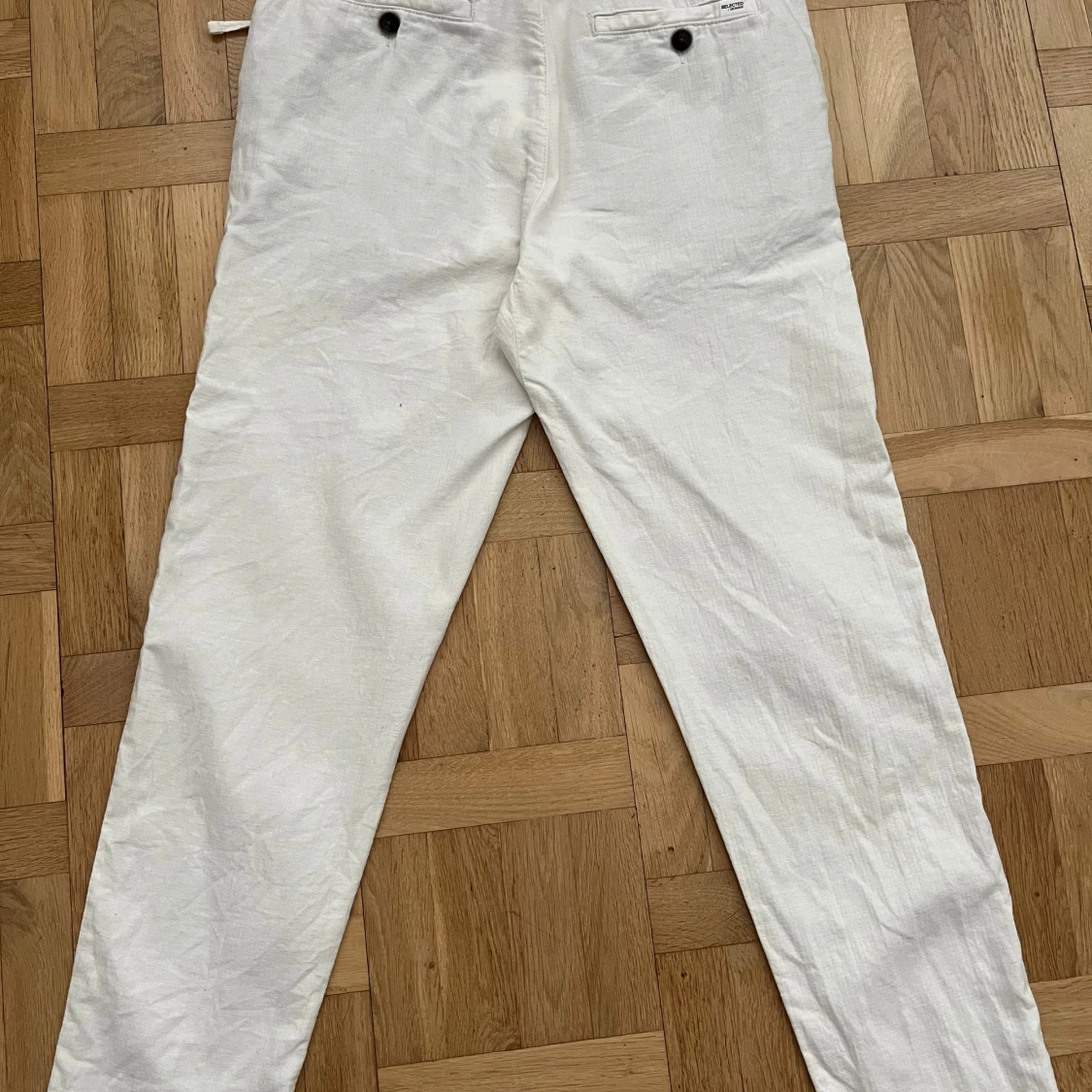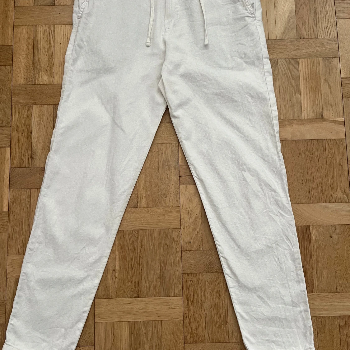 Säljer ett par vita linnebyxor med dragsko i midjan och raka ben. Byxorna har sidfickor fram och två bakfickor med knapp. Perfekta för varma dagar och en avslappnad stil. Köpta på jenasbolaget förra sommaren