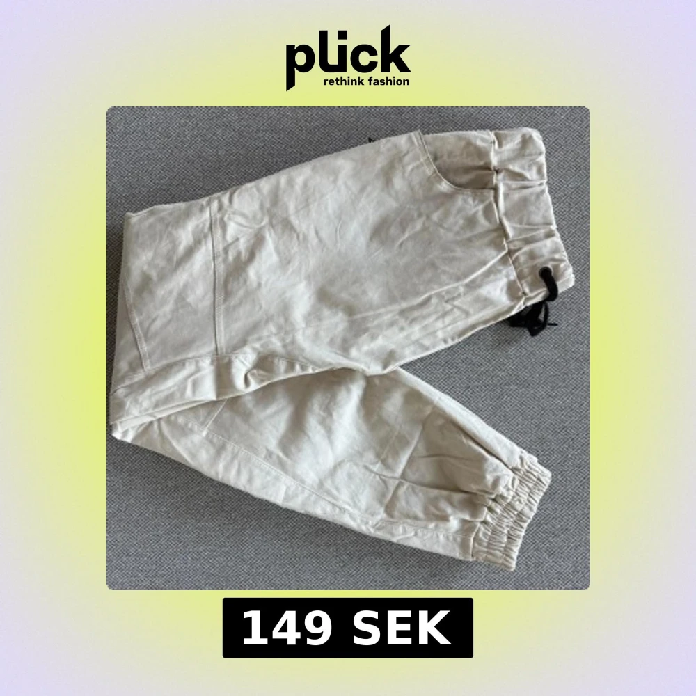 Säljer ett par beiga med elastisk midja och svart snörning. Byxorna har fickor på sidorna och baktill samt elastiska vid bensluten. Perfekta för en avslappnad stil.