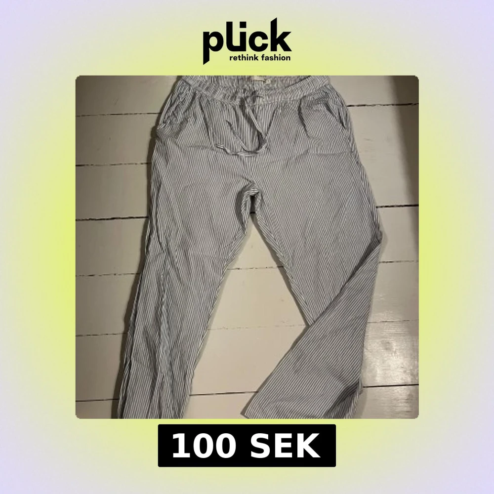 Supersköna randiga byxor i blått och vitt med elastisk midja, storlek M. Byxorna har en loose passform och är luftiga och bekväma. Supersköna att ha på sommaren! Dock har de inte kommit till användning då de är för korta för mig🤍🩵