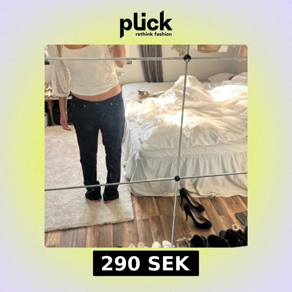 Snygga svarta byxor med lÄg midja. Jag har storlek S/M i byxor i vanliga fall. Det stÄr att byxorna Àr i st EUR 31.
