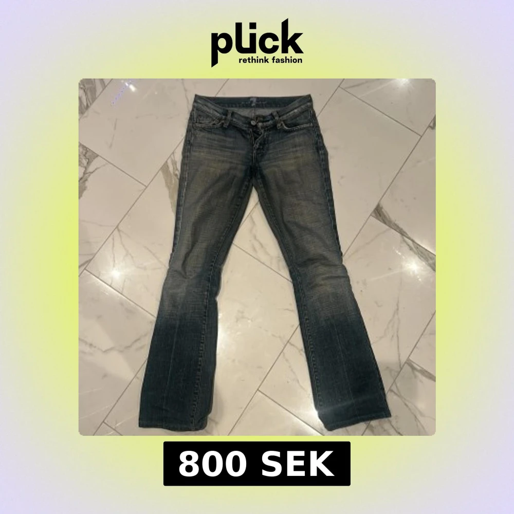 Snygga blå jeans från 7 for All Mankind med en klassisk bootcut-stil. De har en låg midja och en lätt tvättad look som ger en jättesnygg look. Jättefina och sitter jöttebra. Har en vintage look vilket är mycket populärt nu och så är de i super kvalite. Passar mig som har storlek 34/w25/26 vanligtvis.❤️