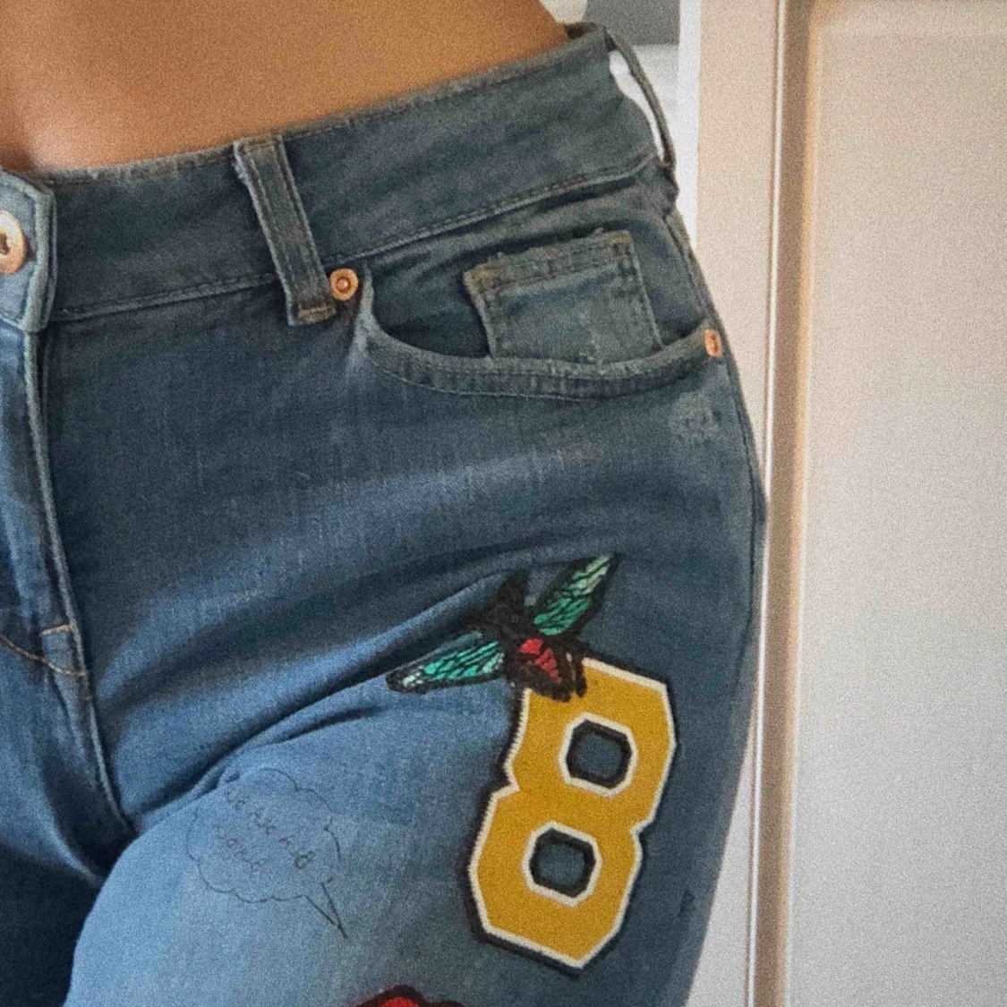Perfekt skick! Hål på knäet och broderat över framsidorna! Går precis över naveln!