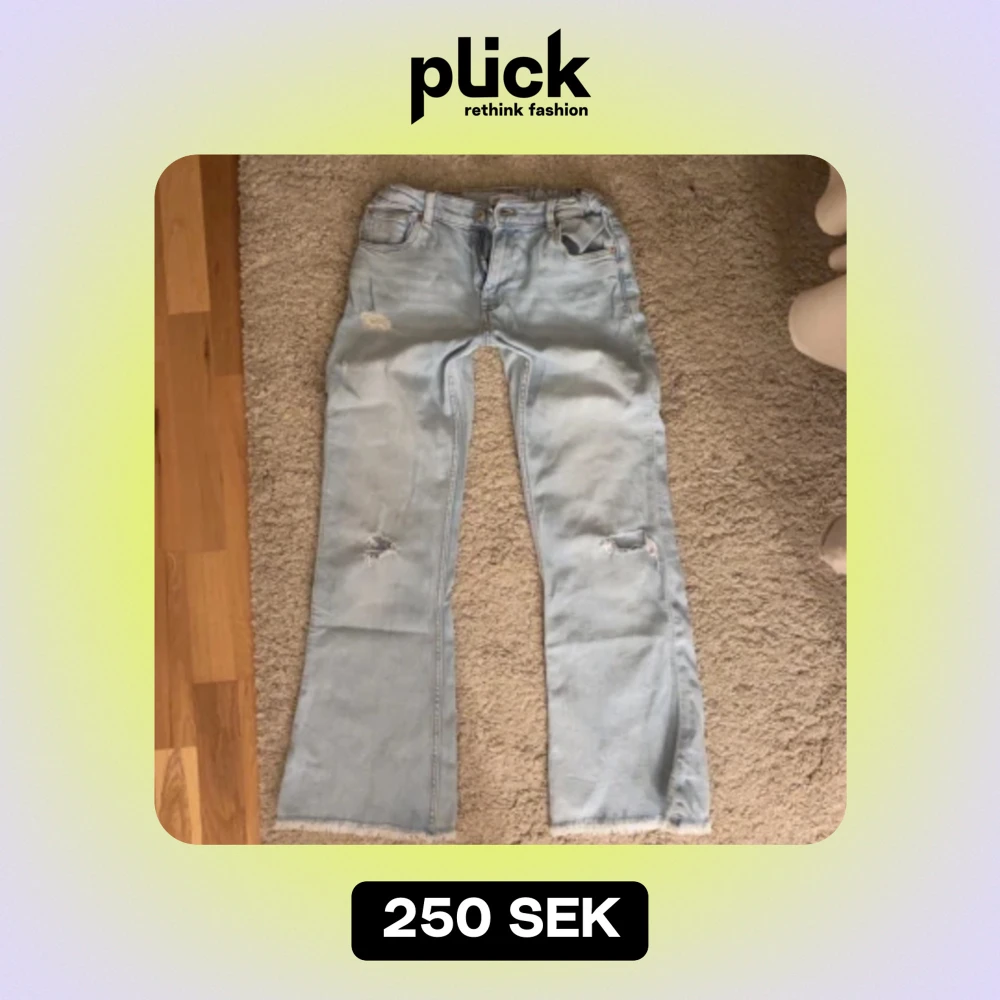 Säljer dessa ljusblåa lågmidjade jeans med hål i sig som är modellen. Dessa är ifrån zara och säljer de pga att de är för korta för mig som är 170 cm drygt, så passar någon runt 165cm. Helt nya! Kontakta via intresse eller köp🥳pris kan diskuteras
