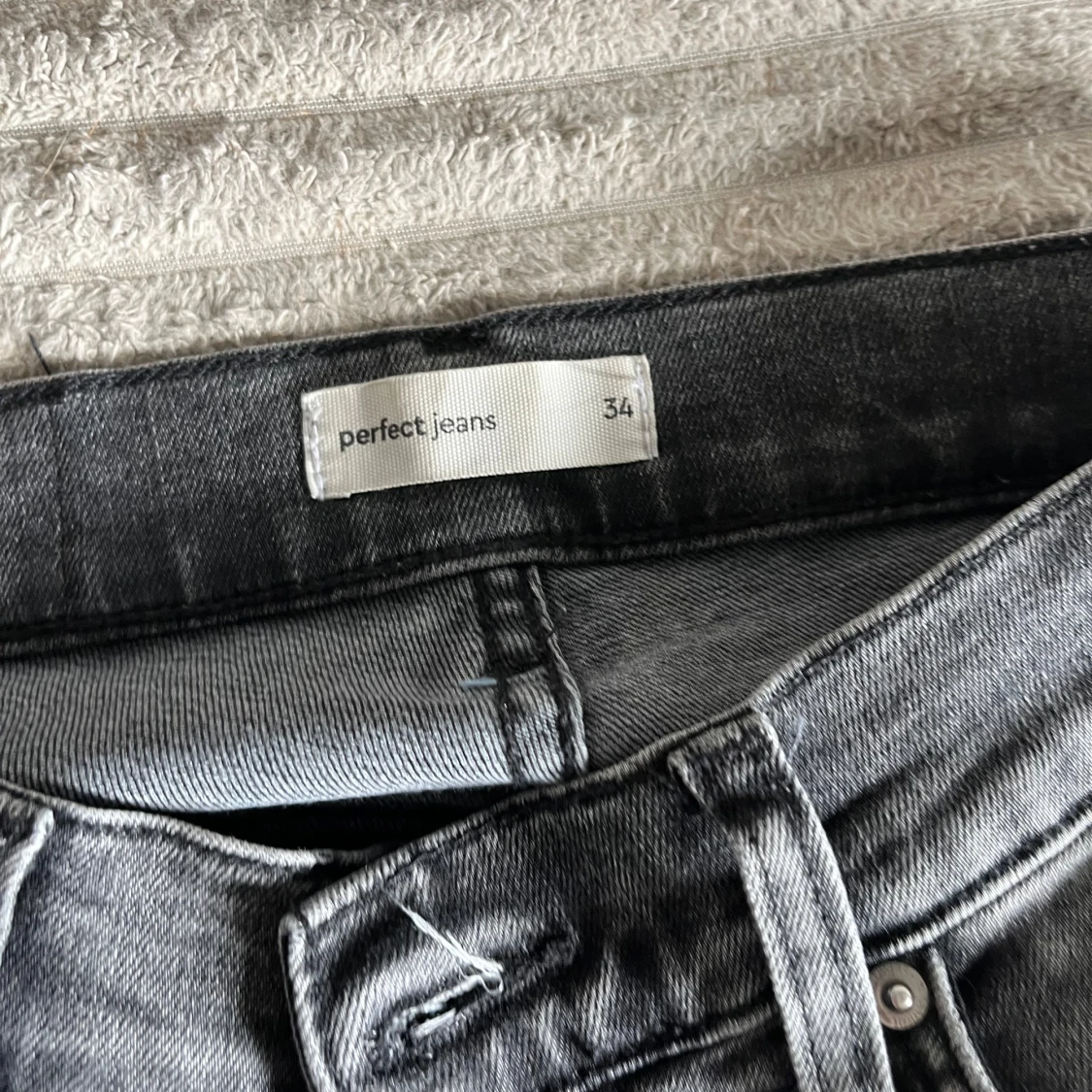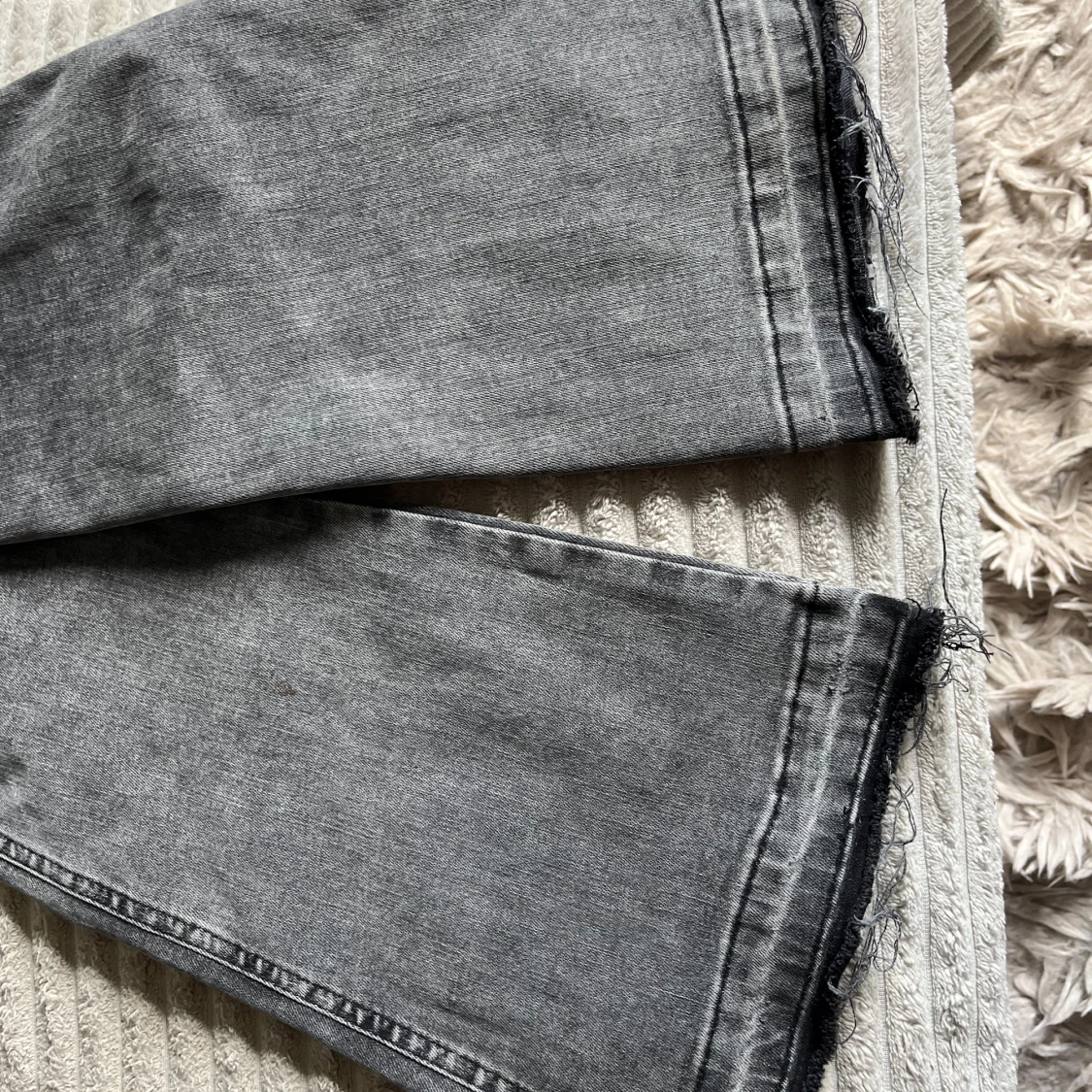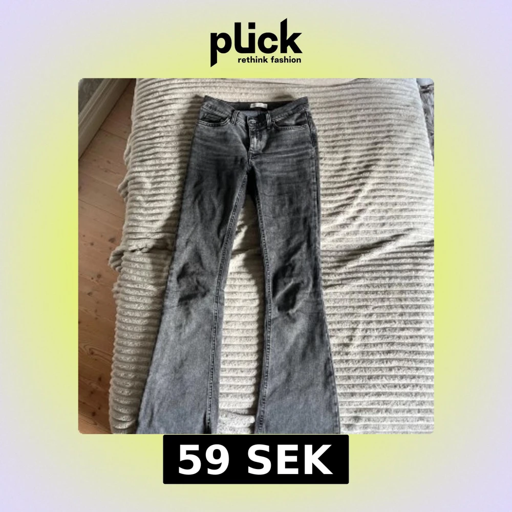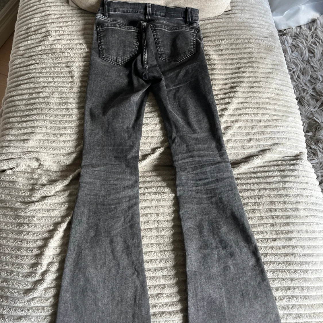 Snygga svartgråa jeans från ginatricot med medelhög midja med utsvänga ben. Har sprättat upp dom längst ner så dom blir längre. Säljer då dom inte kommer till användning längre! Storlek 34