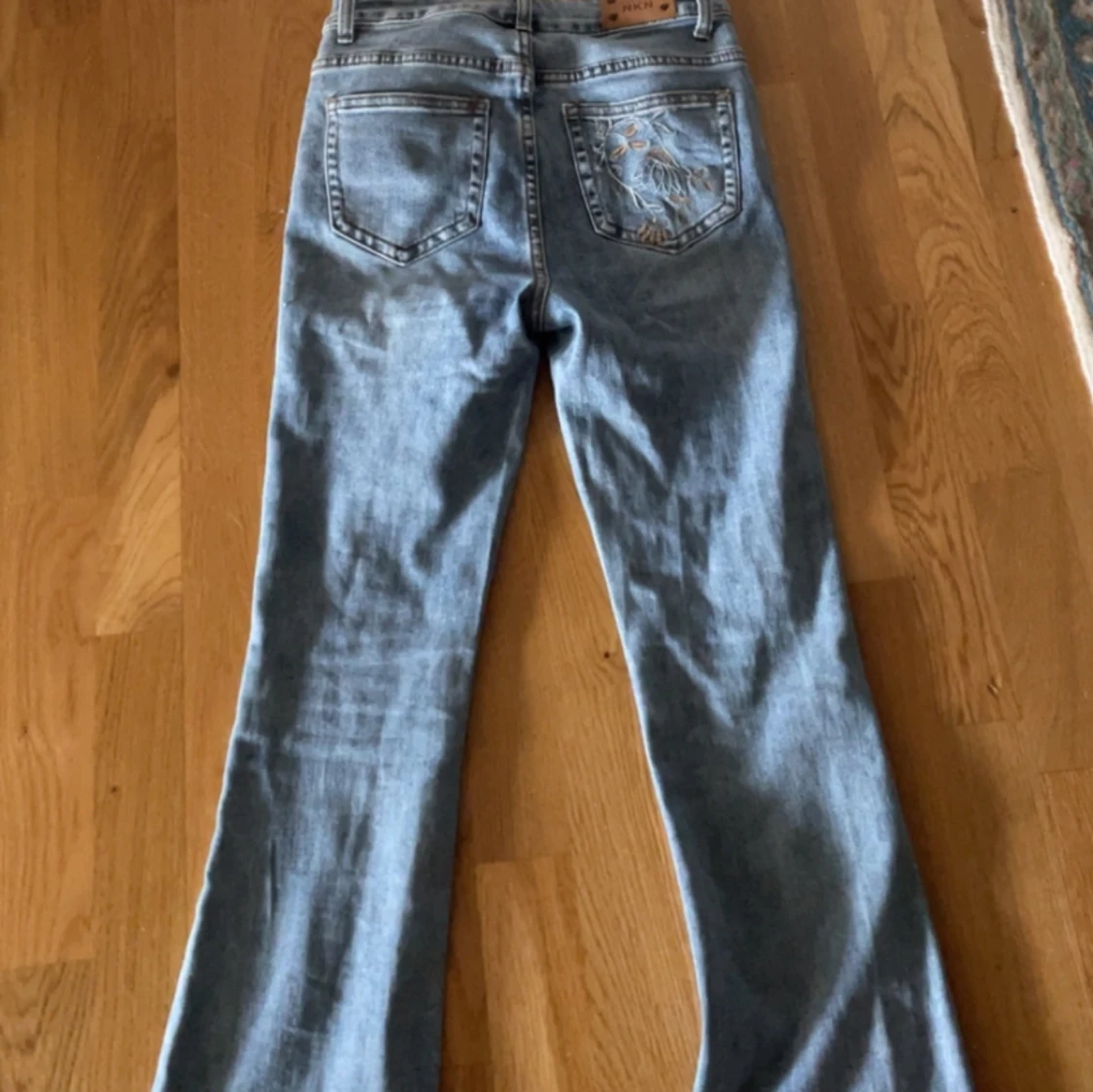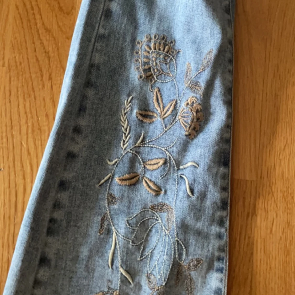 Säljer mina helt oanvända jeans med blom detaljer från Spanien, nypris är 800, kontakta för mer info🥰