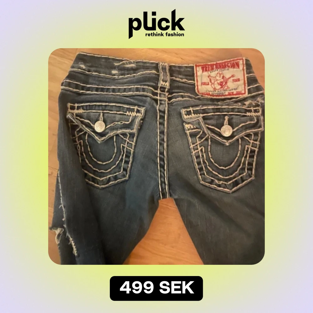 Säljer mina älskade true religion jeans, köpt här på Plick❤️ säljer billigt då de finns ett litet håll på baksidan av benet som man inte tänker på Innerbenslängd: 75 midjemått tvärsöver:35