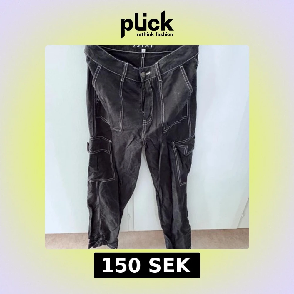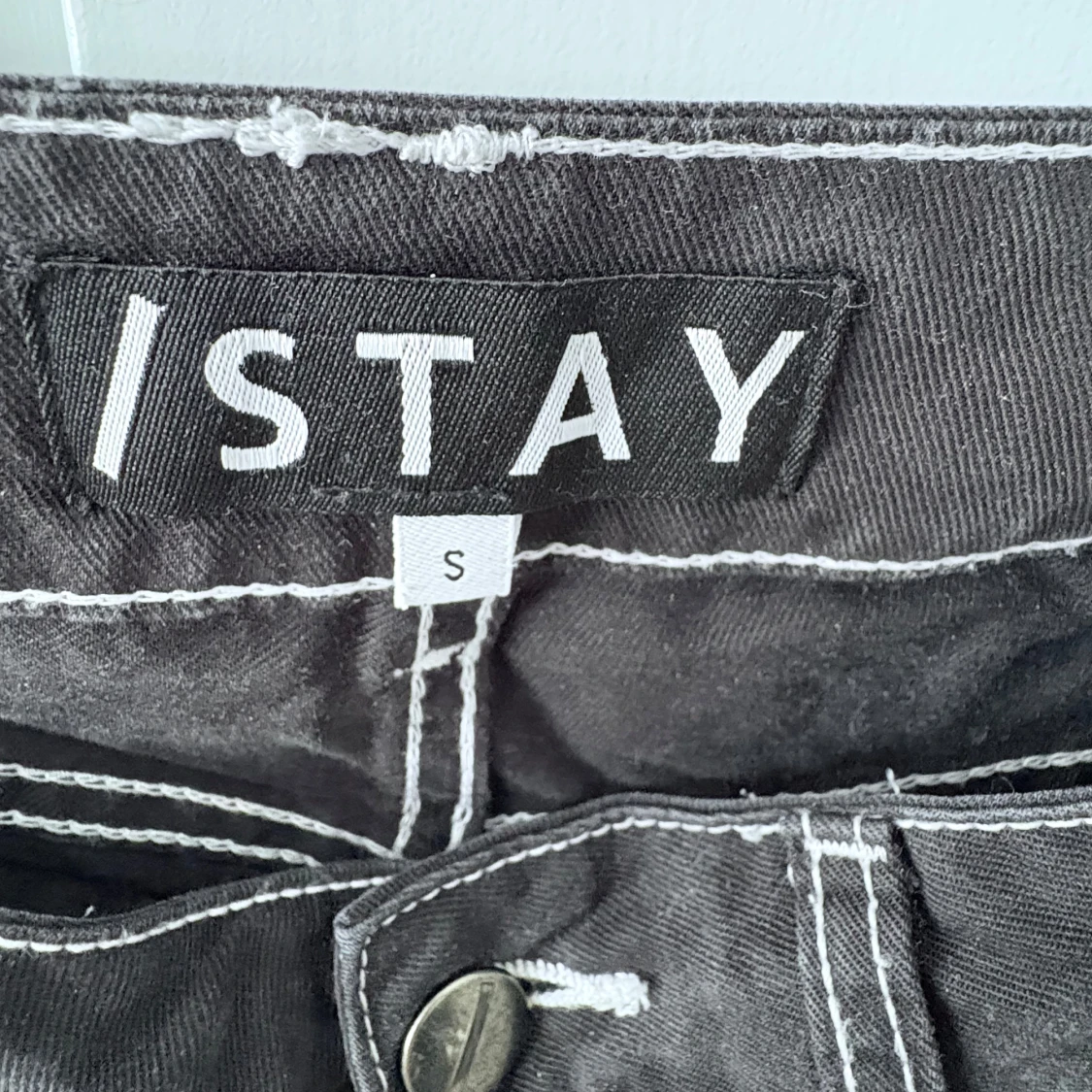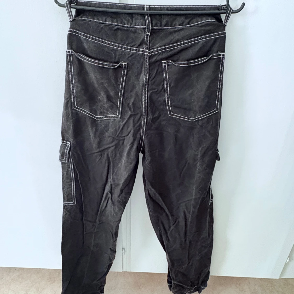 Svarta cargopants från Stay med kontrasterande vita sömmar och flera fickor på benen. Byxorna har normal passform och stängs med knapp och dragkedja. Perfekta för en avslappnad och trendig stil.