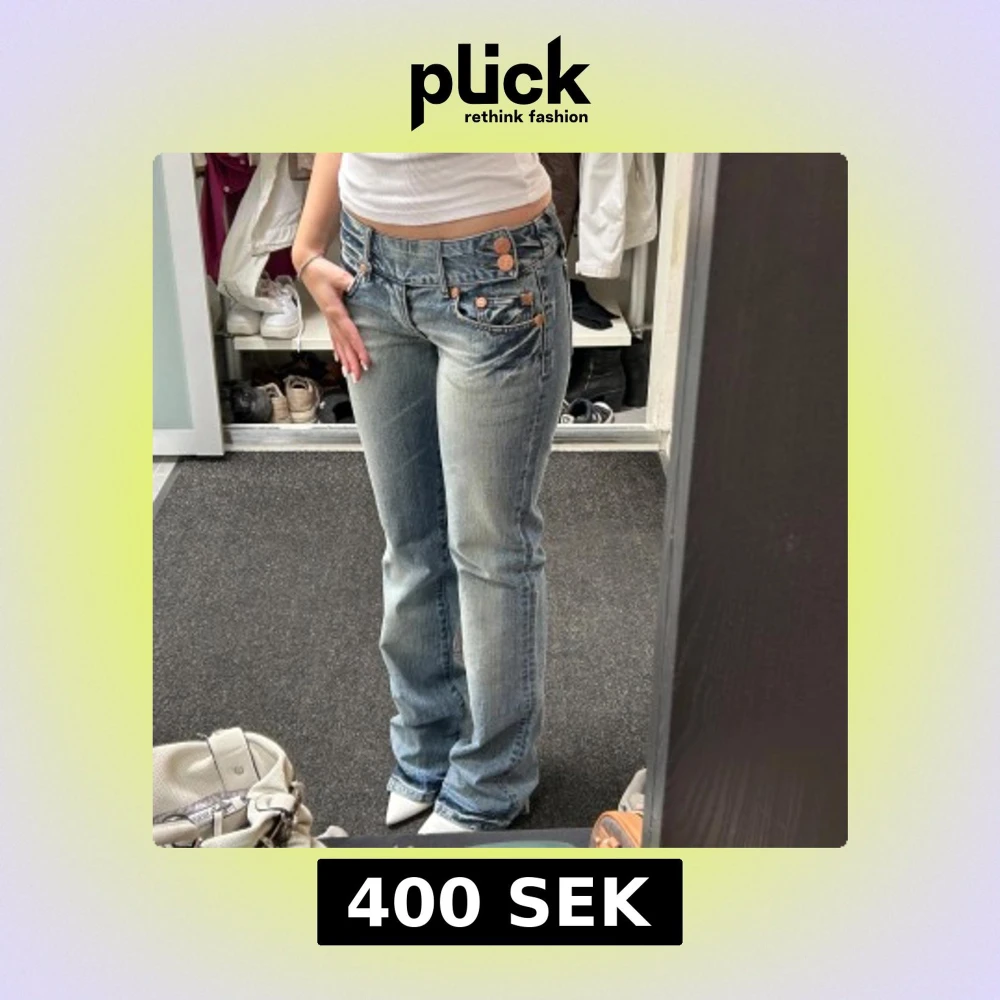 Säljer dessa sviiinsnygga jeansen med så snyggt spänne framtill🤍 de är för långa för mig så har klackar på bilderna! Innerben: 85cm Midja: 36cm