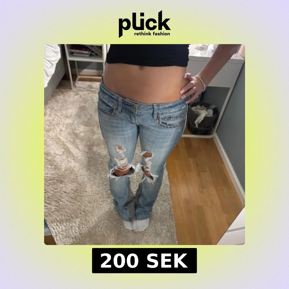 Säljer ett par ljusblå jeans från American Eagle. 💗De är låg midjade, bootcut och har slitna detaljer med hål på knäna. Snygga nitar vid fickorna framtill. Står ingen storlek men passar mig som har 34 i jeans. Jag har sytt in de lite i benen och gjort små hål på innersidan av midjan men inget som syns utifrån!💗 skriv för frågor elr bilder