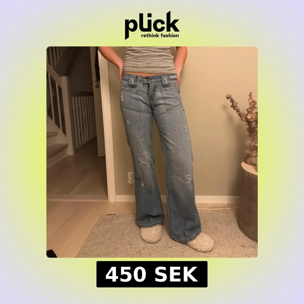 Säljer ett par blå jeans med coola slitningar som sitter skirbra❤️❤️hör av er vid frågor