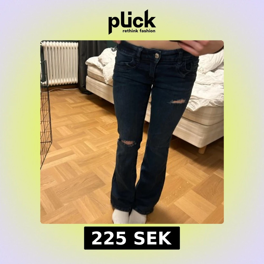 Säljer ett par mörkblå jeans med slitningar på knäna. De har en bootcut-stil och är lågmidjade. Perfekta för en avslappnad look. Aldrig använda bara testade. Skriv om ni har fler frågor🫰