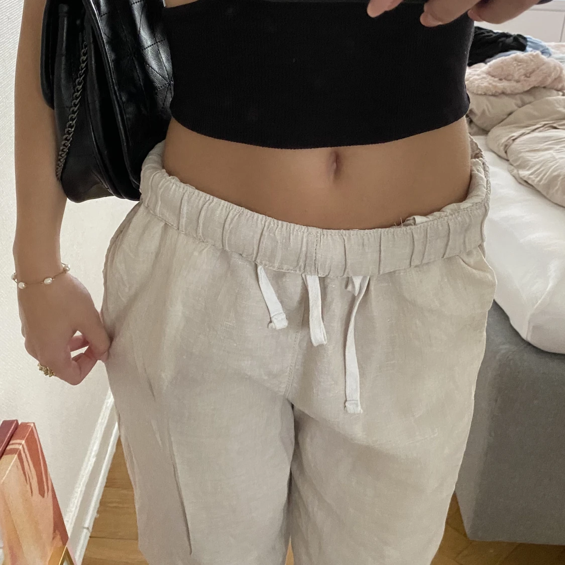 säljer mina beiga linnebyxor i storlek s från hm som inte kommer till användning längre💓