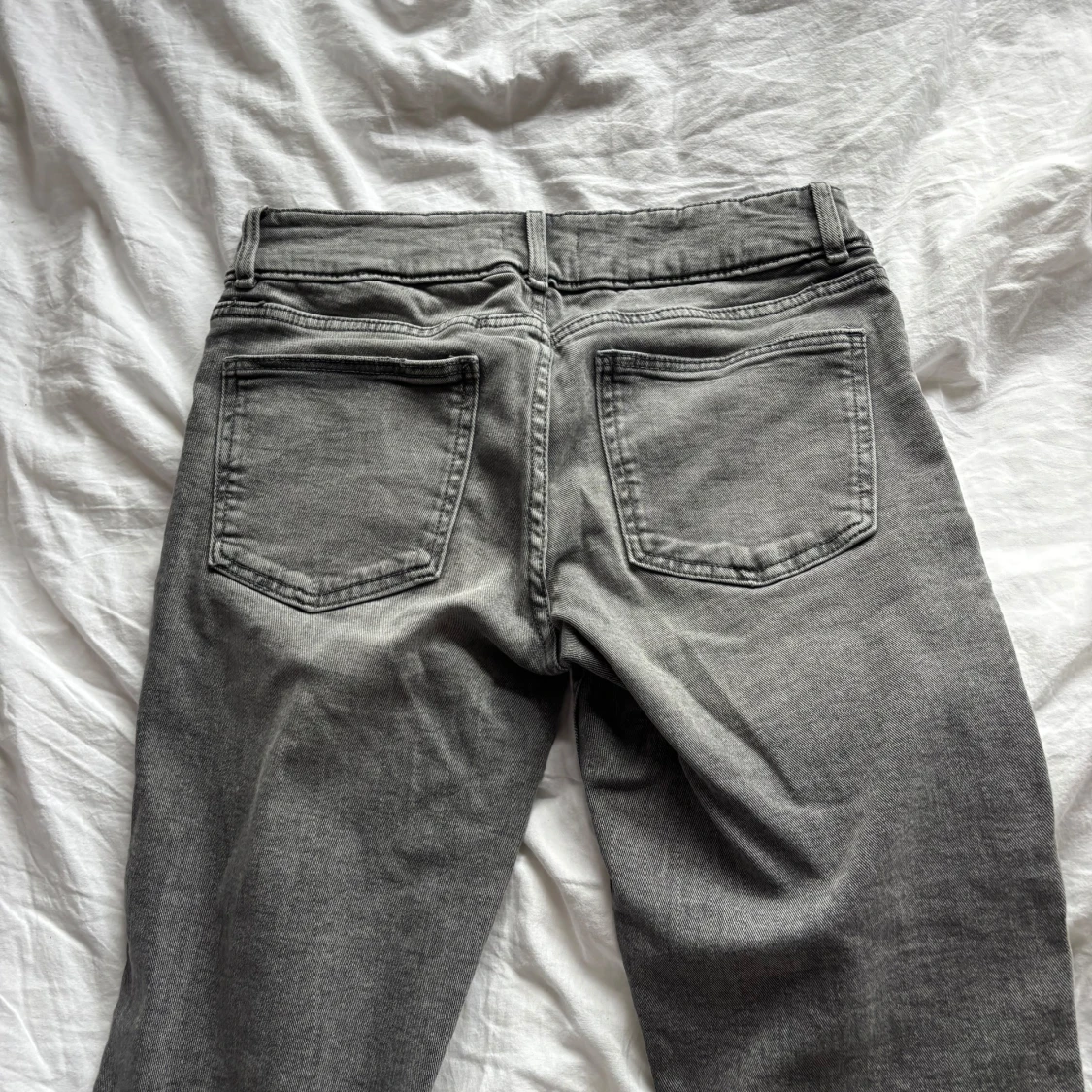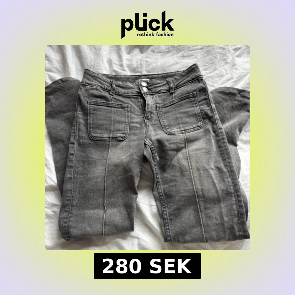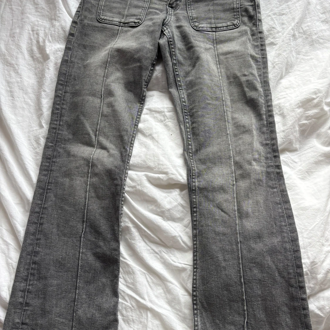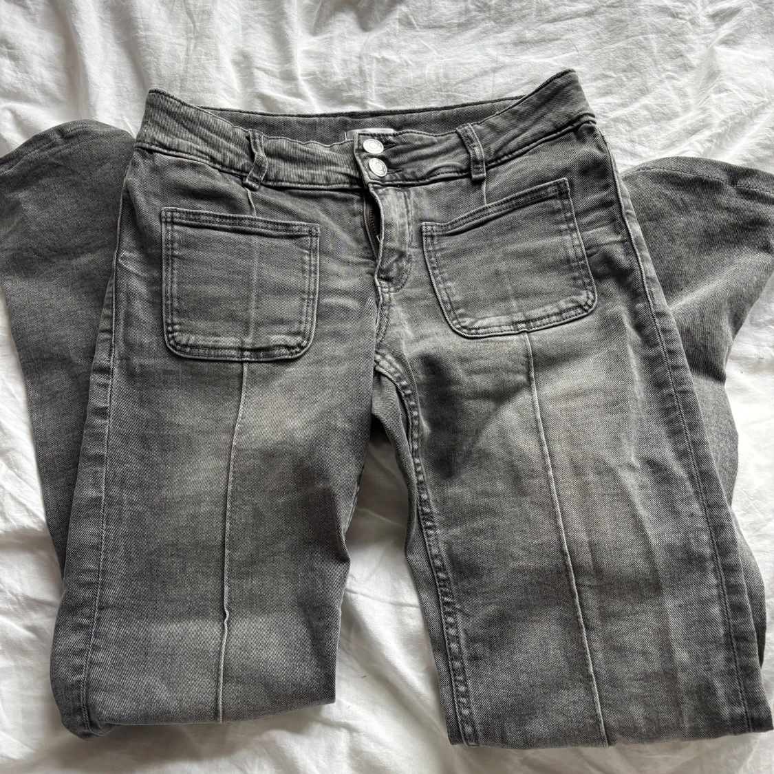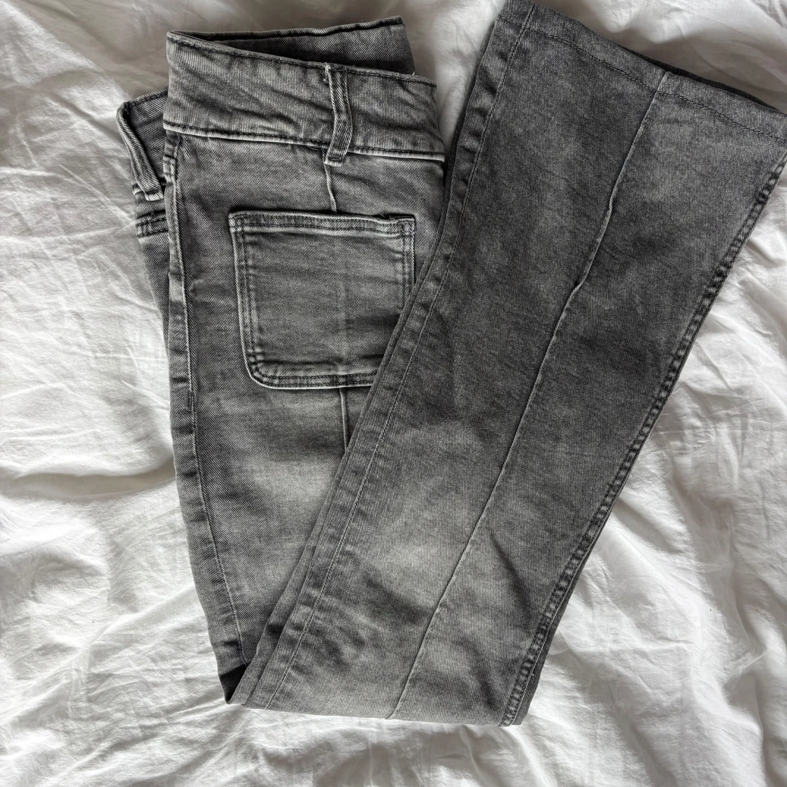 Snygga grå jeans med bootcut och markerade sömmar längs benen och stora fyrkantiga fickor fram. Modellen har bootcut-ben och klassiska bakfickor. Jeansen har dubbelknäppning och bälteshällor, perfekta för en cool och avslappnad look.