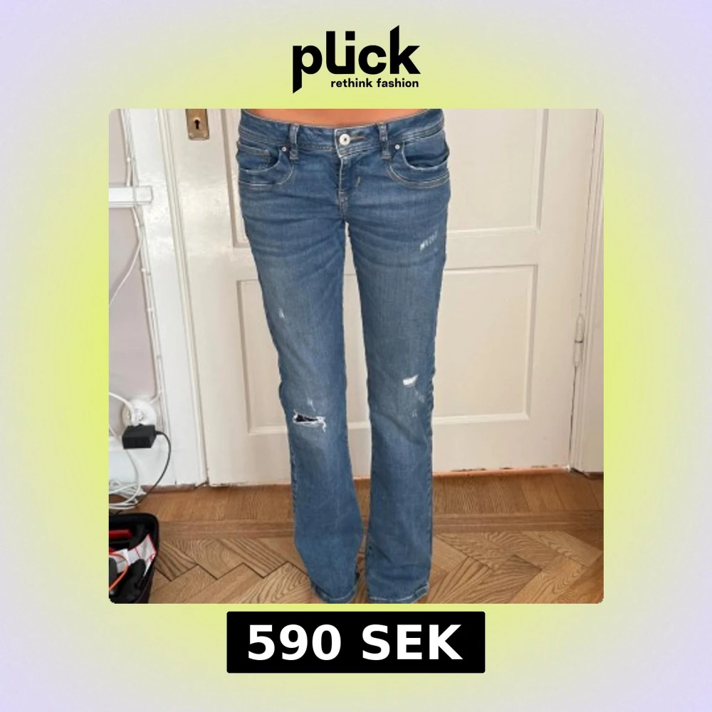 Säljer ett par blå ltb jeans med bootcut och låg midja. Jeansen har slitna detaljer och hål på ena benet för en cool, avslappnad look. Klassisk femficksmodell i jeansmaterial med ljus tvätt och vita sömmar. Storlek 28W, 32L