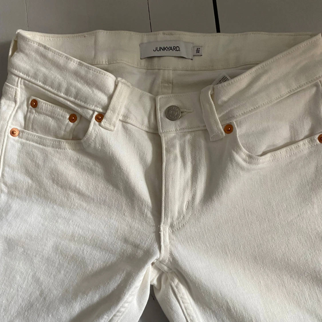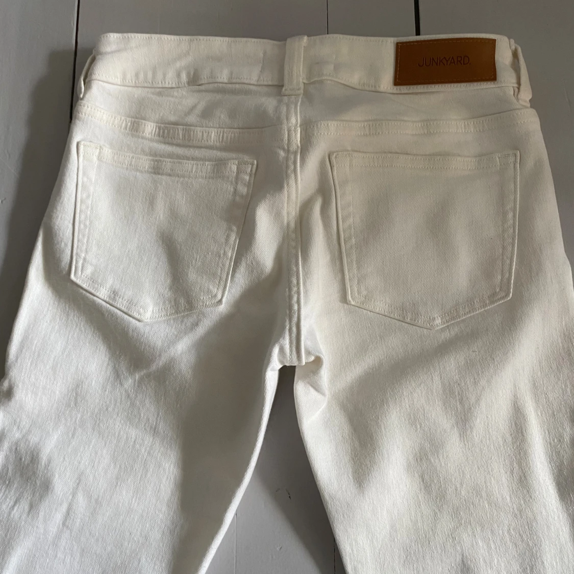 Säljer dessa vita lågmidjade jeans från junkyard, storlek 27/34 vilket motsvarar en S! Använda en gång, nypris 599! Skriv för mått eller fler bilder🤍