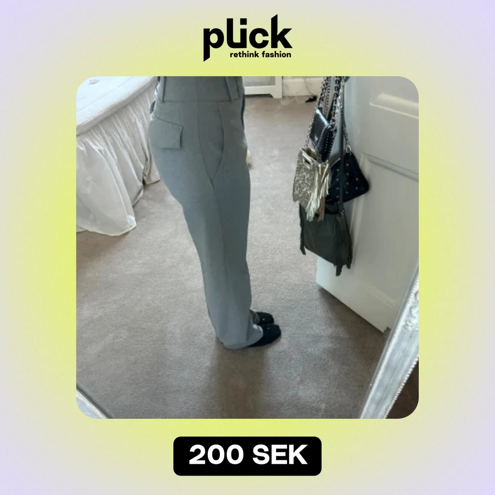 Säljer ett par ljusgrå kostymbyxor med fickor på rumpan!! Supersöta! Mid/lowwaist på mig som brukar ha 32-34 i byxor! Skriv för fler foton!!💕