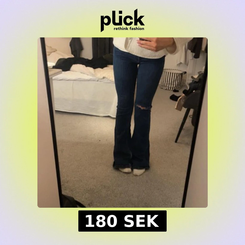 Snygga blå bootcut jeans med ett hål på ena benet. Har dock en liten slitning på rumpan, men går nog att sy själv eller lämna in hos skräddaren!
