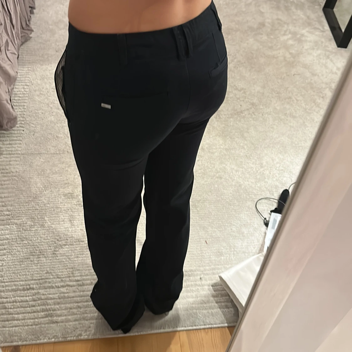 As snygga lågmidjade utsvängda kostymbyxor som sitter perfekt i rumpan och midjan!!😍😍😍sjukt svåra att hitta som den som köper har tur😍🙌🏼 Jag är 161 cm Midjemått: 37 cm Innerbenslängd: 85 cm
