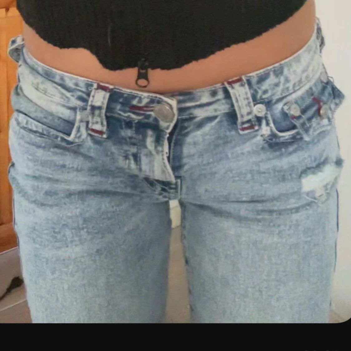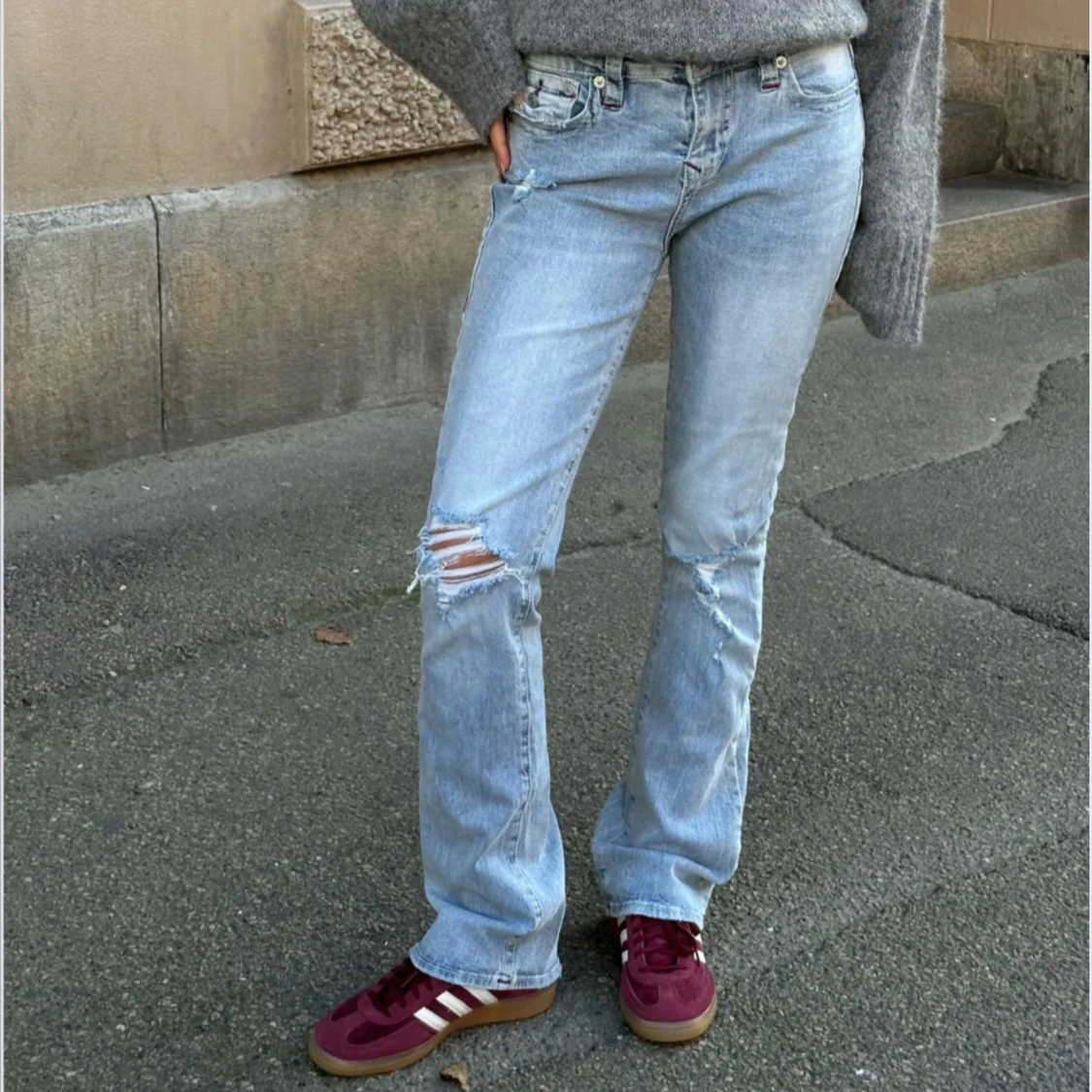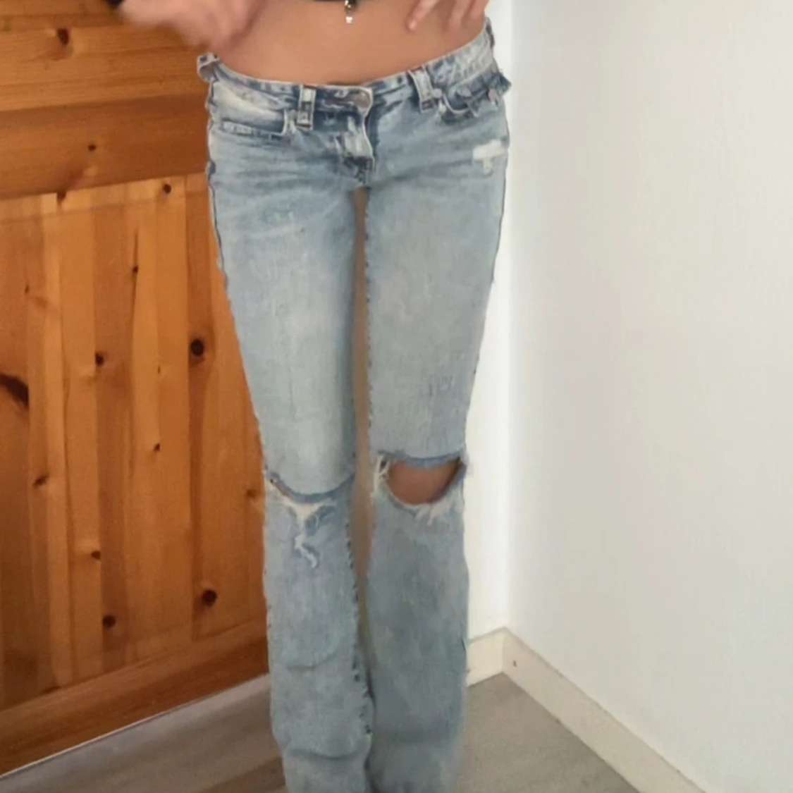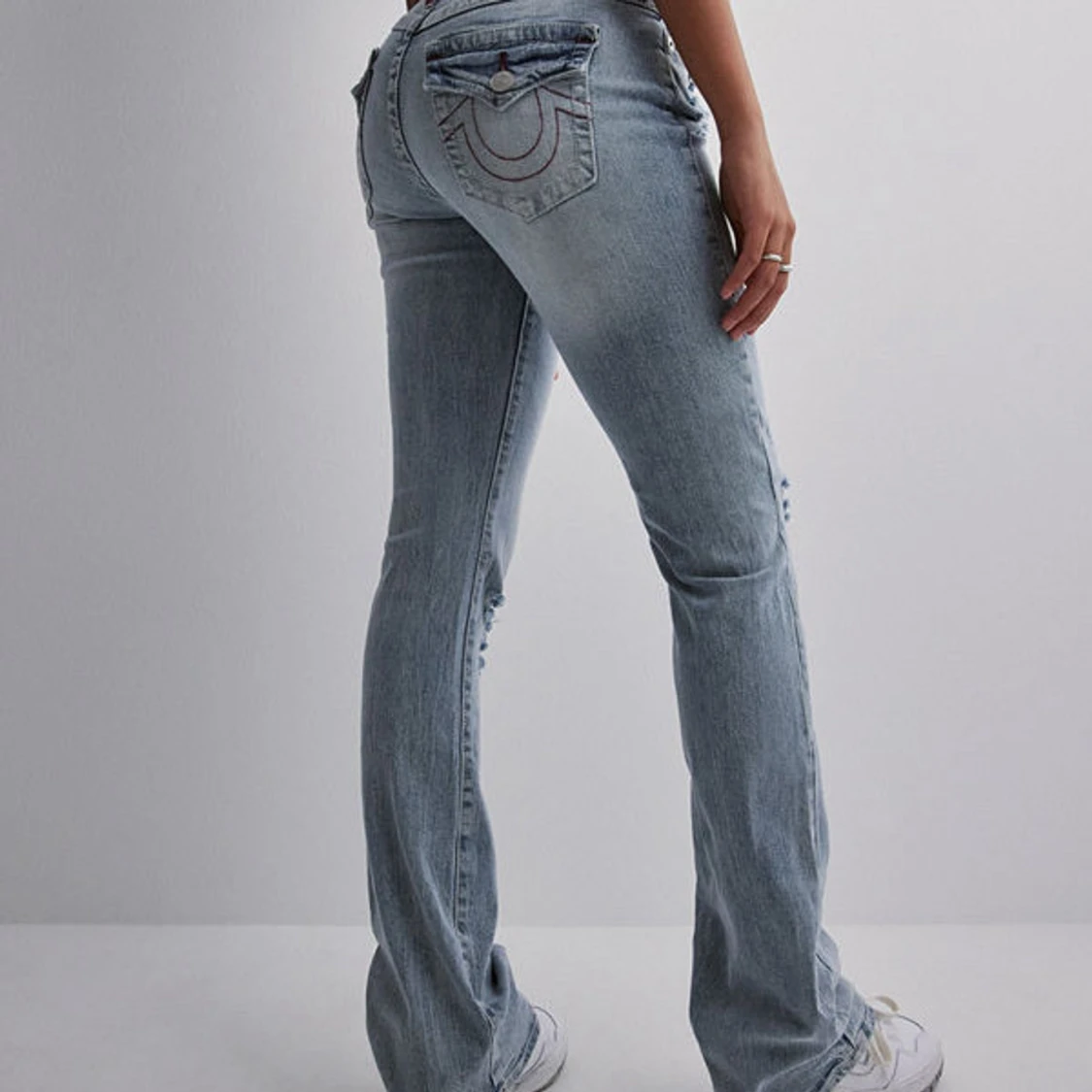 - pris kan diskuteras!! - Säljer ett par ljusblå bootcut jeans från True Religion med slitningar och hål på knäna. Jeansen har låg midja, skriv för mer bilder❤️ dem är i storleken w25❤️nypris är 1299kr❤️