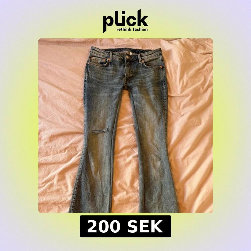 Snygga blå jeans med en klassisk femficksdesign och slitningar på framsidan. De har en knappgylf och är i en bootcut-stil. Perfekta för en avslappnad look.