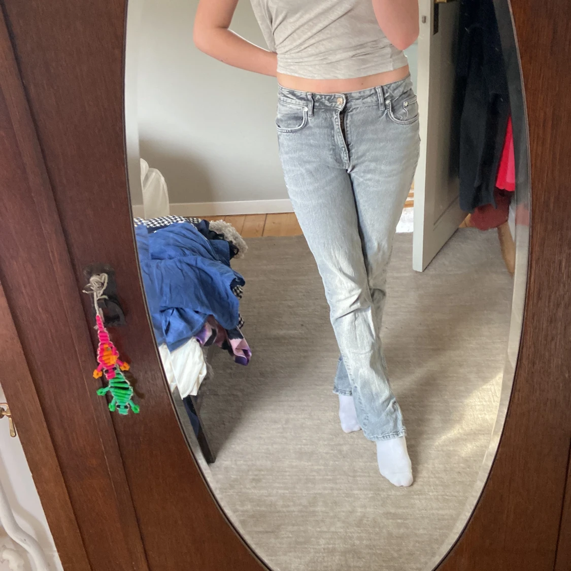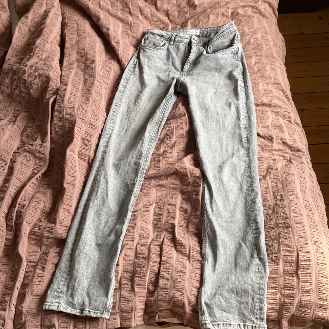 Säljer dessa suuper snygga gråa jeans som är straight och midwaist med slittning!! Köpt för 499 på zara och säljer för 299!!😍😍😍