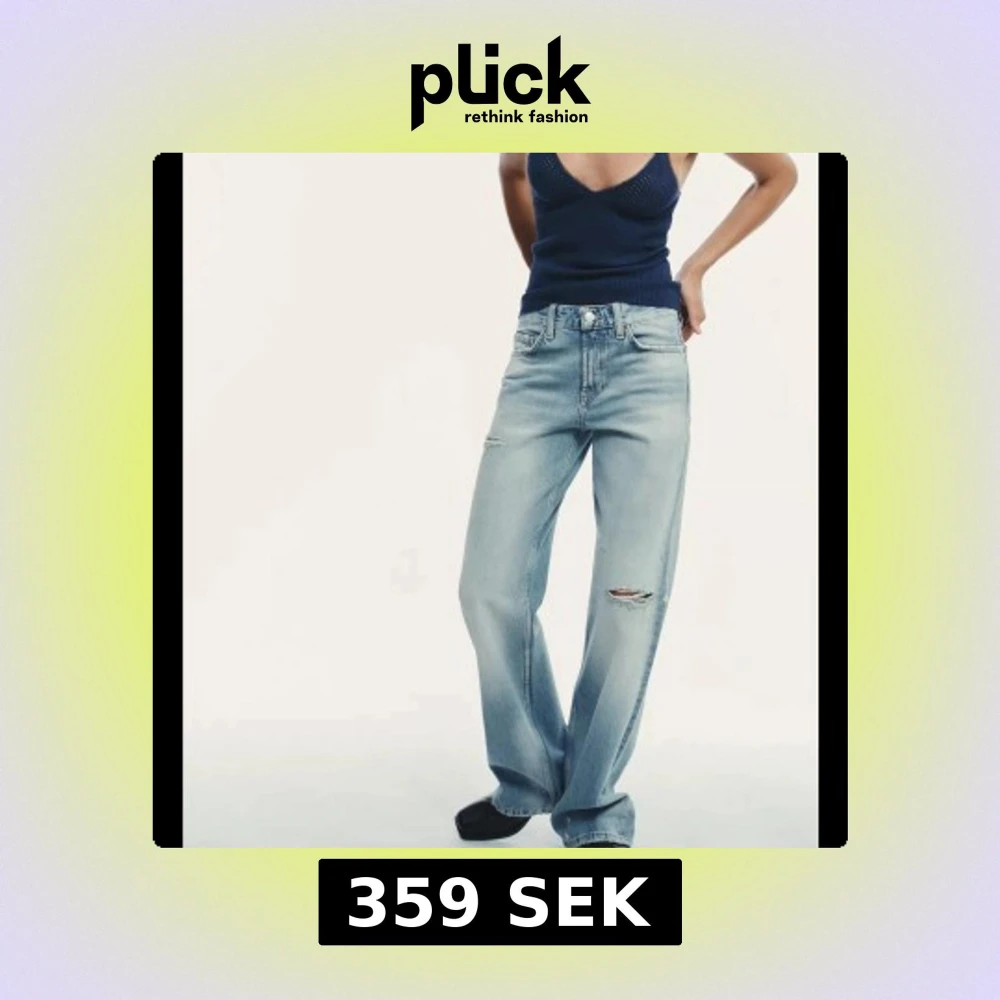 Snygga ljusblå jeans med breda ben och slitna detaljer vid knä och lår från Zara. Modellen har klassisk femficksdesign och normal midja. Jeansen är tillverkade i denim och har en avslappnad, loose passform som ger en cool vibe.