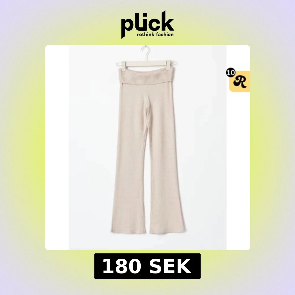 Snygga beige stickade byxor med ribbad midja. Perfekta för en avslappnad stil med en bekväm passform. Byxorna har en lätt utsvängd stil som ger en modern touch. Använda 1 gång
