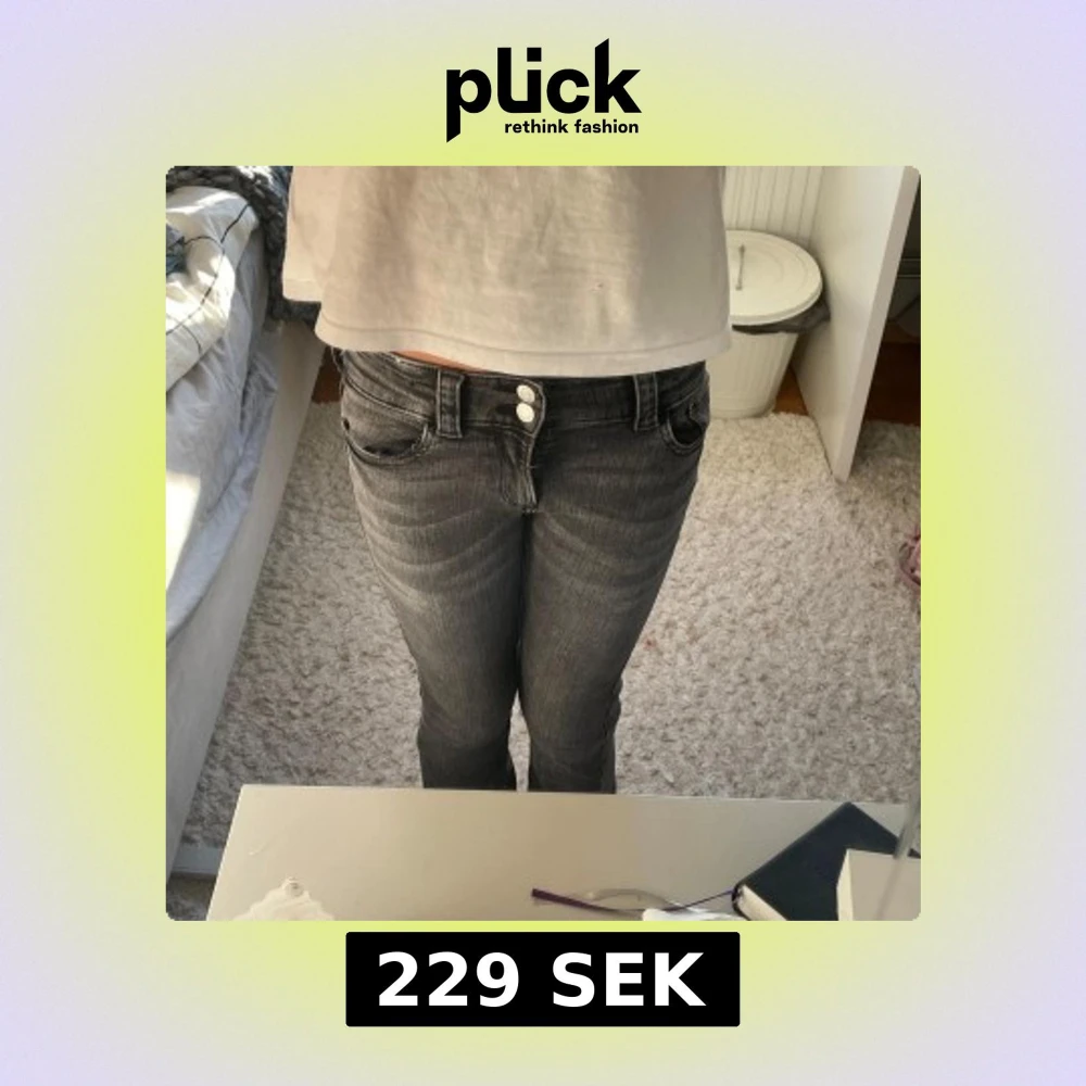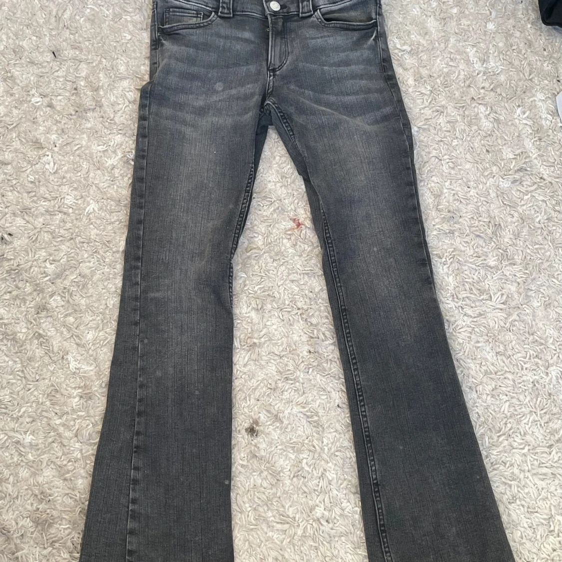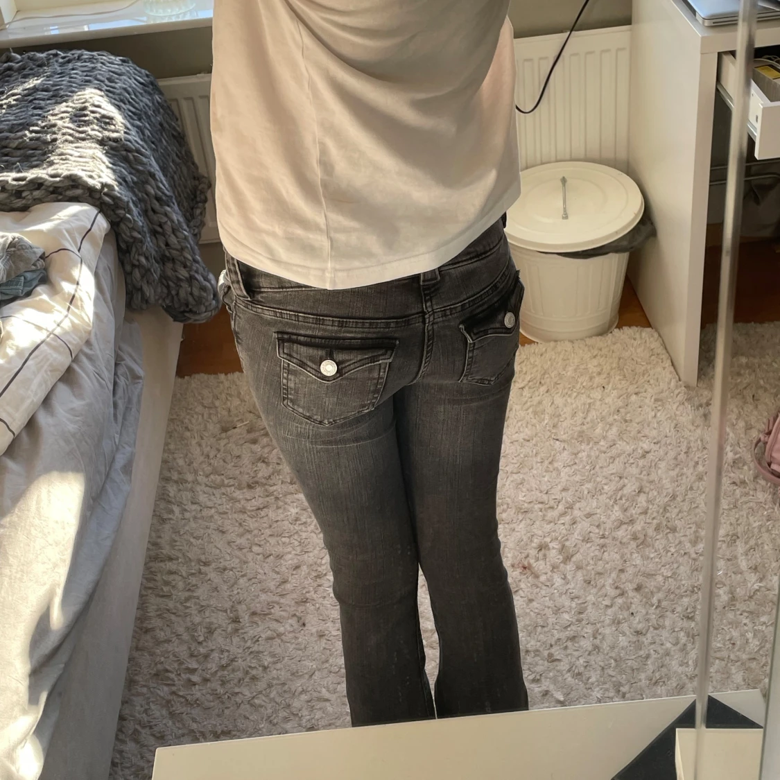 Snygga grå jeans från H&M med bootcut-ben och låg midja. Jeansen har justerbar midja och dubbla knappar fram! Jättefina för höst!🍂💞