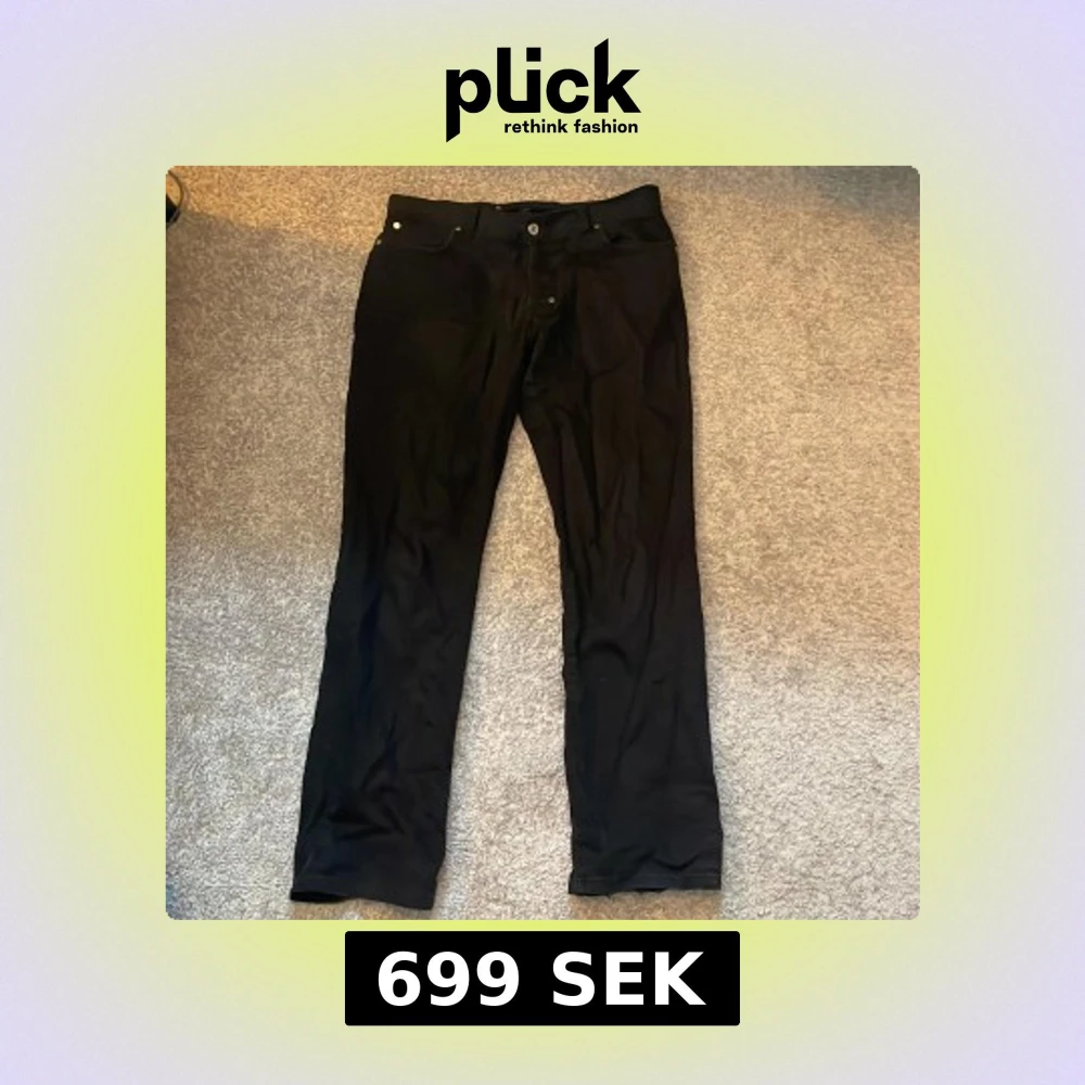 Svarta byxor från Pour med klassisk femficksdesign och raka ben. Byxorna har silverfärgade knappar och bälteshällor. Materialet är mjukt och har en lätt glans, vilket ger en stilren look. Nypris ligger på ca 1500. Perfekta för hösten och för dig som gillar enkel och clean stil. Inga större defekter utan är i väldigt bra skick! 💯