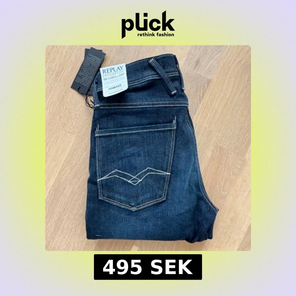 Nya mörkblå jeans från Replay i modellen Anbass. Slim passform och är tillverkade i Hyperflexmaterial för extra komfort och stretch. Nypris 1600 kr