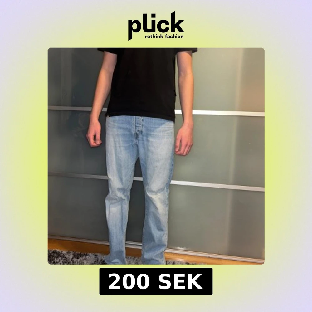 Midja 30 längd 32. Ljusblå klassiska Levi's 501 jeans med rak passform och normal midja. Jeansen har fem fickor, knappgylf och den ikoniska röda Levi's-taggen på bakfickan. Tillverkade i slitstarkt bomullsjeansmaterial, perfekt för en chill och avslappnad stil.