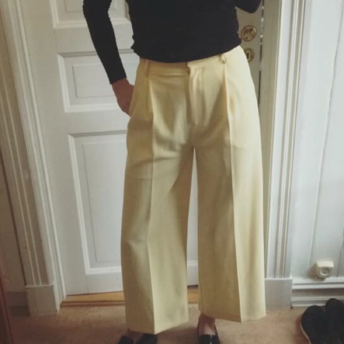 Brallor från ett av Stine Goyas samarbeten med Weekday. Färgen är gul/biege och de har en innerbyxa över rumpan. Motveck fram. Material: Polyester Pistill Palazzo Pants enligt lappen. Hämtas i centrala Göteborg eller skickas mot att köparen bet porto.