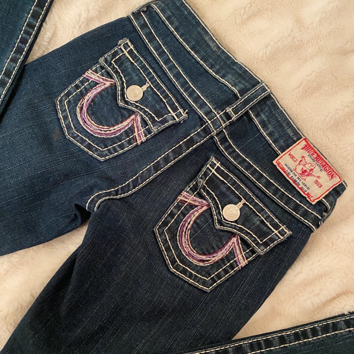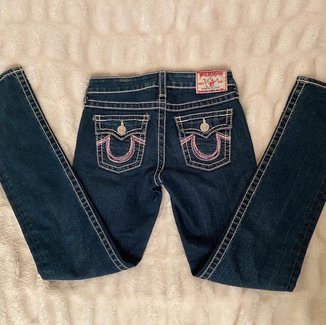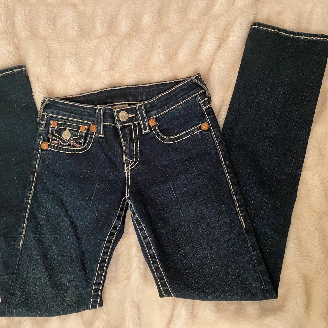 Jeans från True Religion. Inköpta i London, sparsamt använda 🌈 Storlek 12, 74cm midja & 74cm långa om man mäter innerbenet. Jag är 163 cm lång och dom blir lite för korta på mig. Har i vanliga fall storlek 24 i jeans. Kan mötas upp på Östermalmstorg annars står köparen för frakt ✨