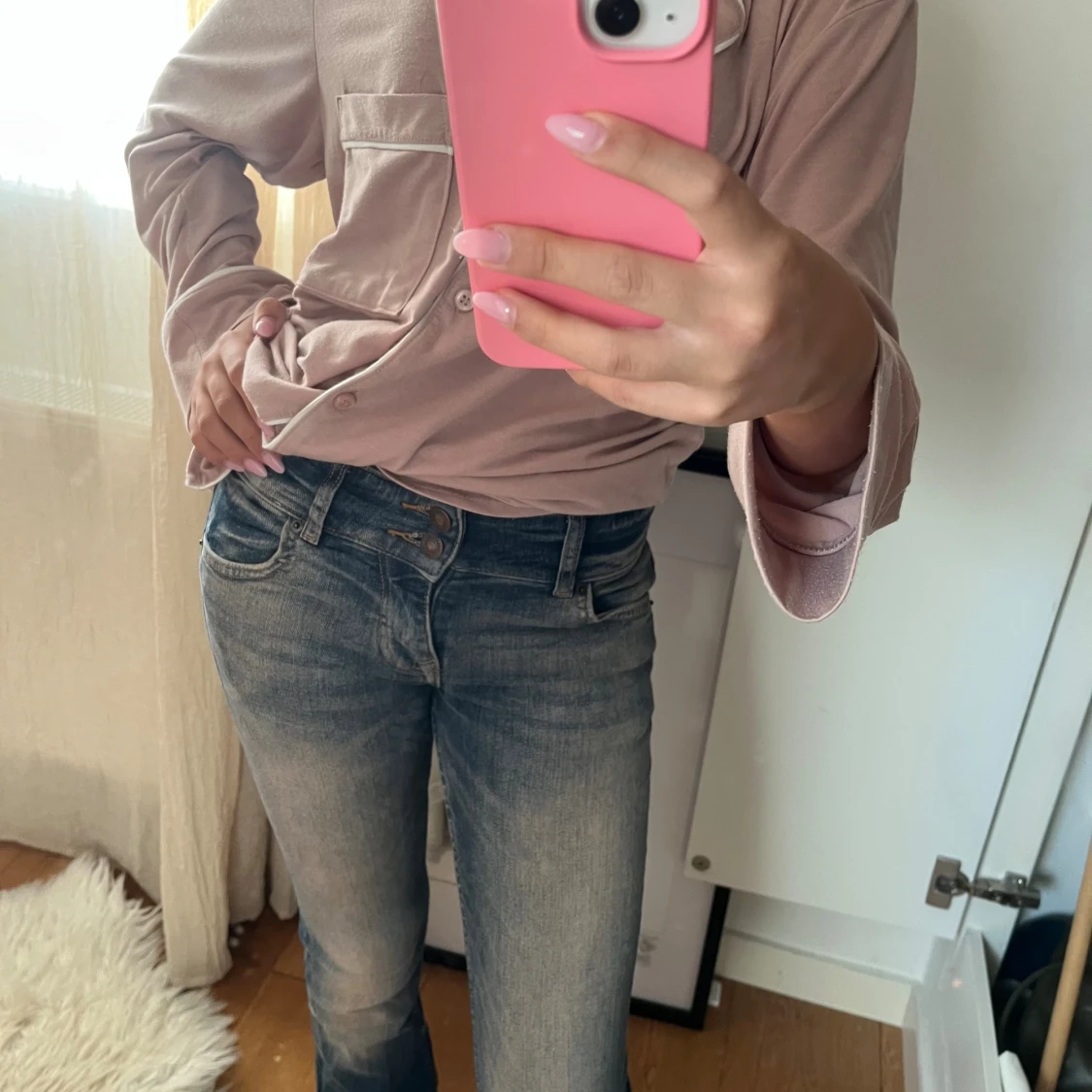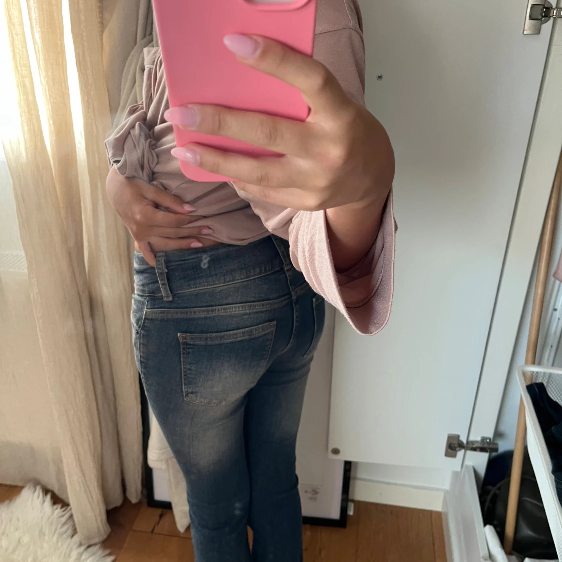 lågmidjade bootcut jeans från berskha som är använda en gång! de är i storlek 34 vilket är Xs! de är små i storleken så skulle säga att de mer är som Xxs! Man kan se att de är helt nya för de är rätt stela och inte uttöjda alls. skriv om ni har frågor