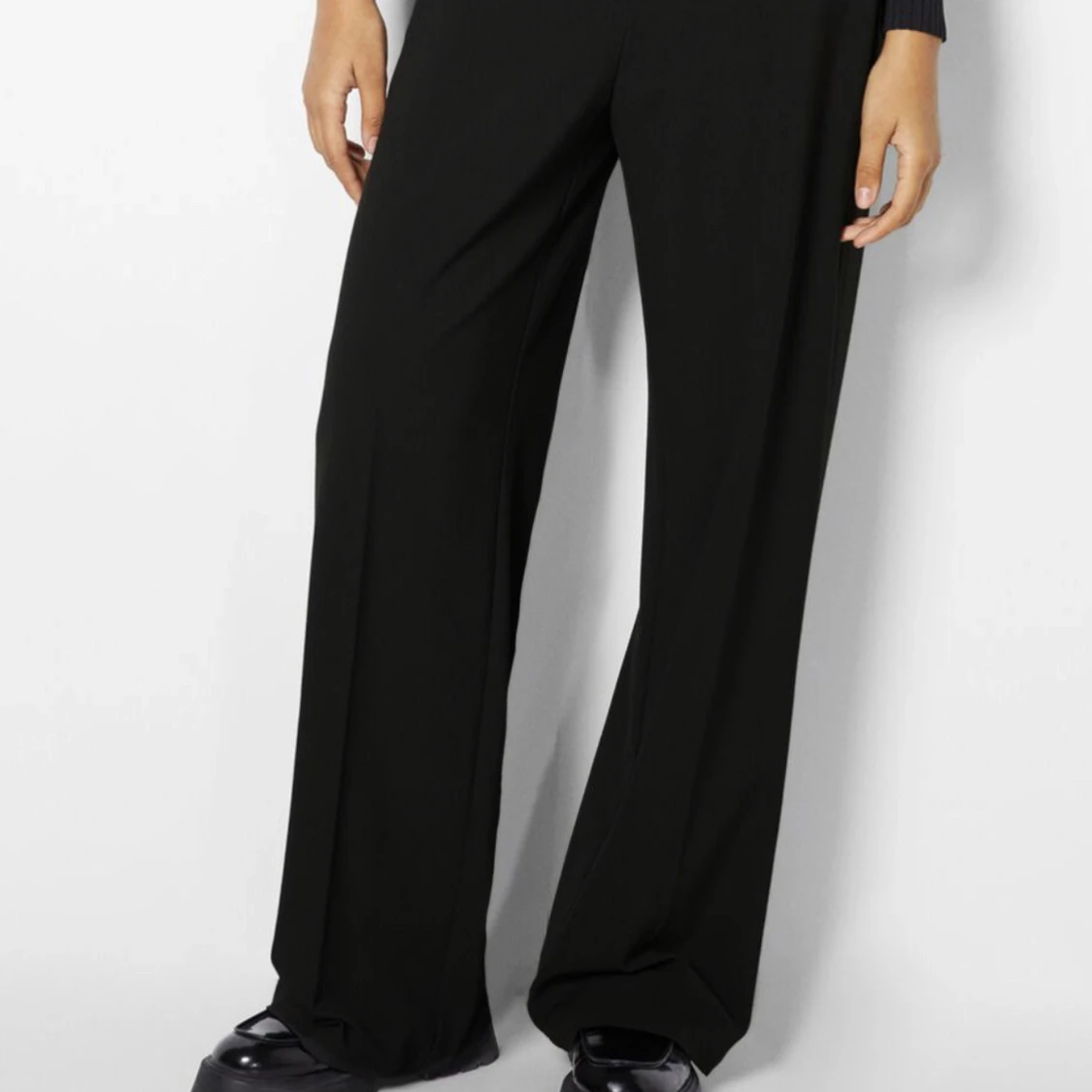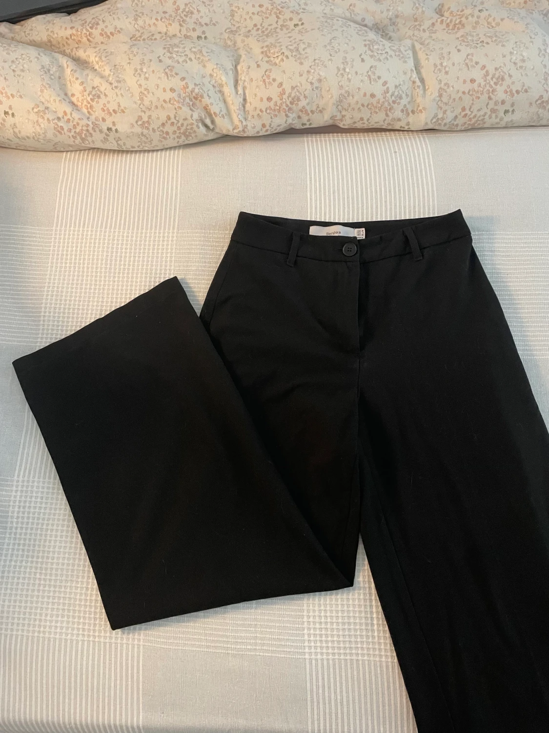 Svarta kostymbyxor från bershka. Användna men är i bra skick. Lös passform med snyggt fall.