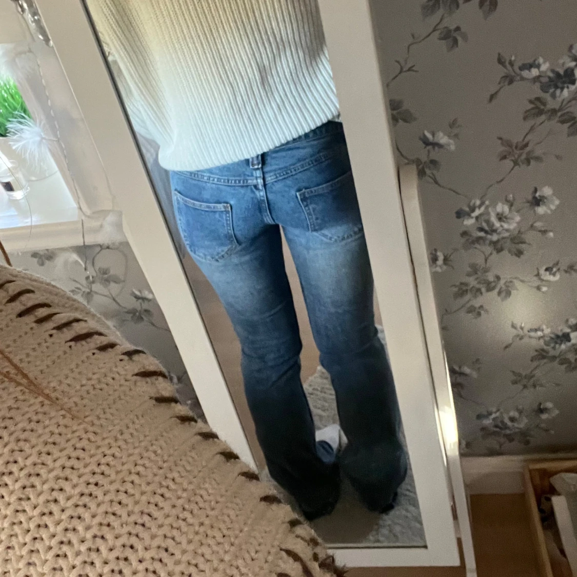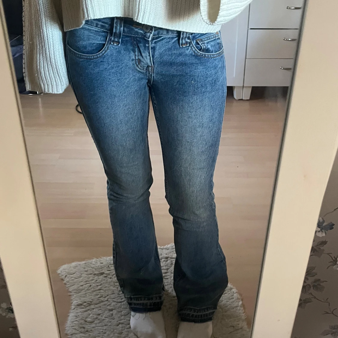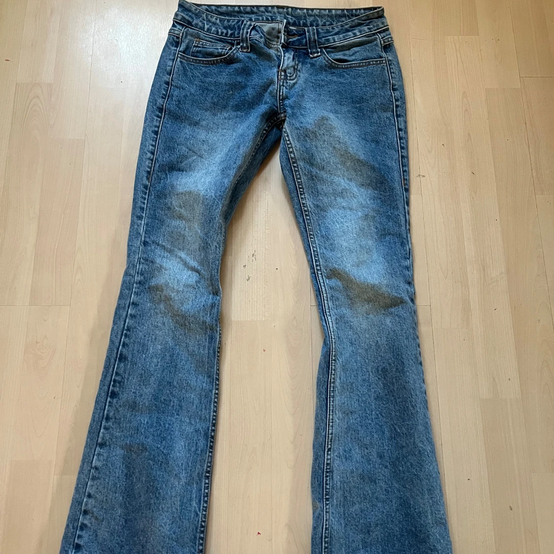 Snygga blå jeans med bootcut-modell och låg midja. Jeansen har klassisk femficksdesign, bälteshällor och dragkedja med knapp. Materialet är jeans i bomull och passformen är normal med lätt utsvängda ben. Midjemåttet är 38 rakt över och innerbenslängden är 80🩷