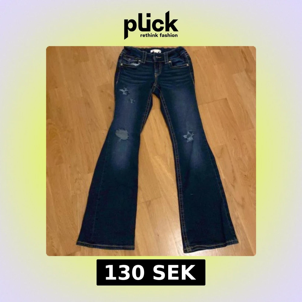 Snygga mörkblå bootcut jeans från Gina Tricot med slitna detaljer. De har en klassisk femficksdesign och en bekväm passform. Perfekta för en avslappnad stil. (Har gjort hålen själv)