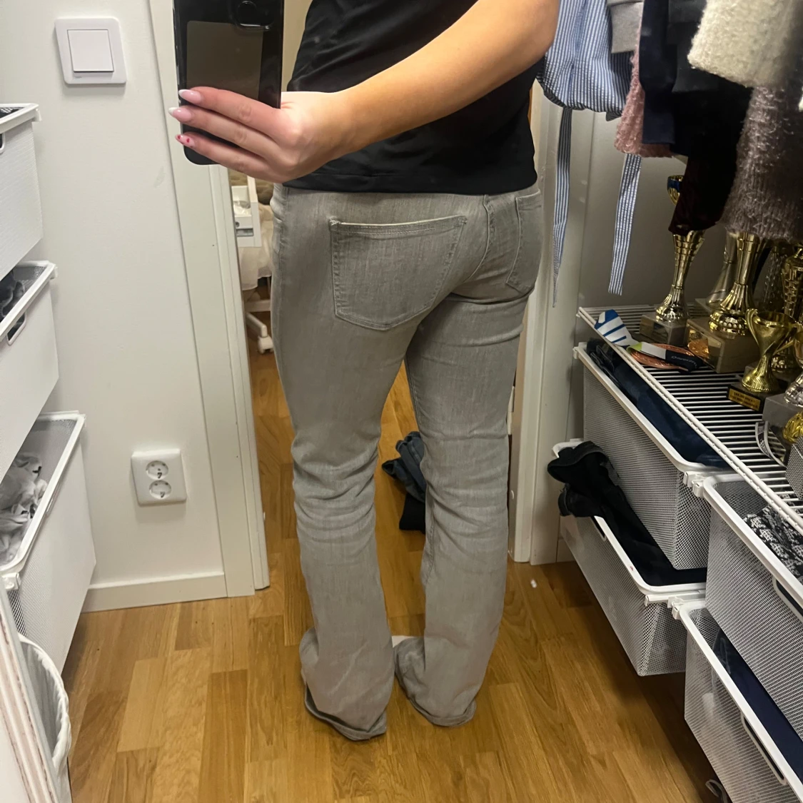 Snygga grå bootcut jeans med en klassisk femficksdesign. De har en lågmidjad passform och är perfekta för en avslappnad stil. Jeansen har en dragkedja och knapp framtill. De är i storlek 164 men passar mig som vanligtvis har S